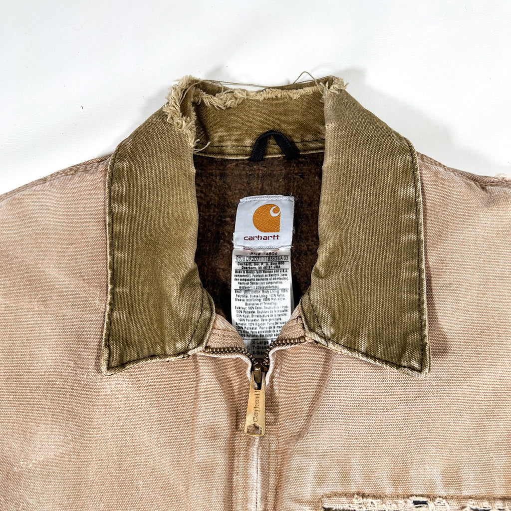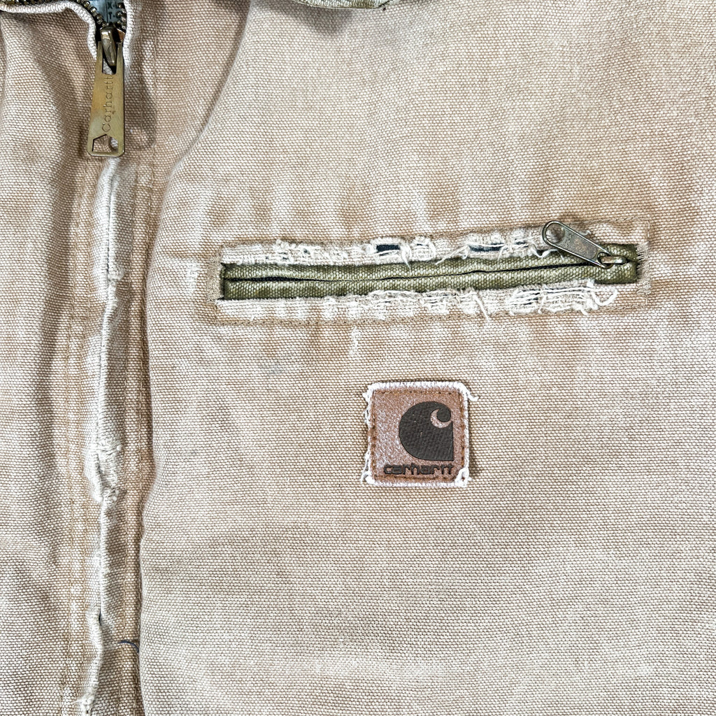 vintage carhartt jacket, carhartt j97, flannel lined carhartt, camel carhartt jacket, 2000s detroit jacket, y2k workwear, vintage workwear coat, sandstone duck canvas jacket, distressed carhartt, mens xl regular jacket