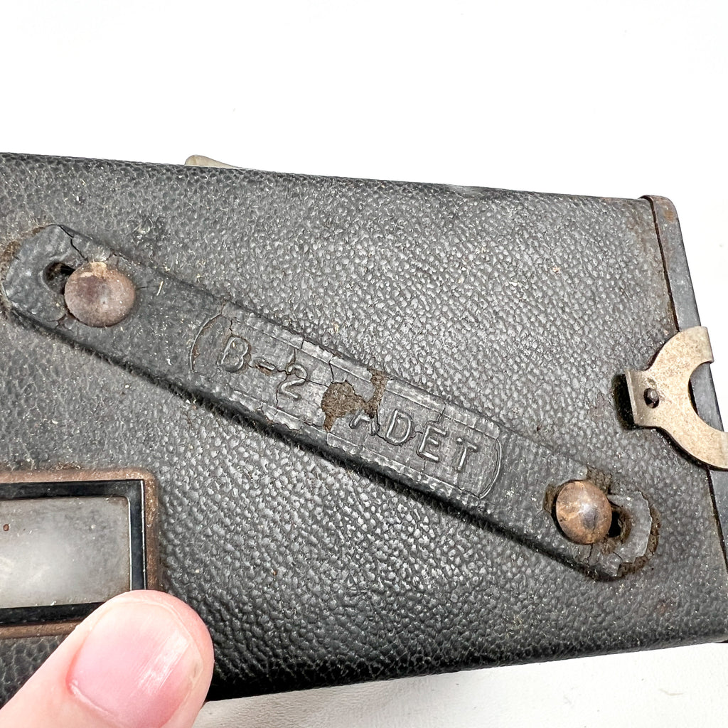 Vintage Agfa Ansco B-2 Cadet box camera produced in the early to mid 1930s by Agfa-Ansco Corporation in Binghamton, New York. This American-made box camera features a fixed lens, rotary shutter, dual brilliant viewfinders for portrait and landscape orientation, and a textured black body with original leather carry strap stamped “B-2 Cadet.”