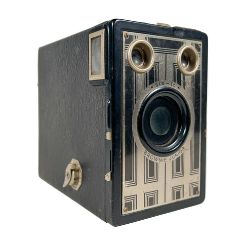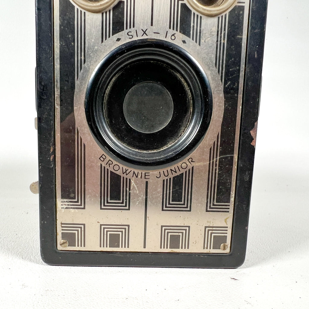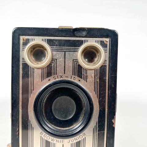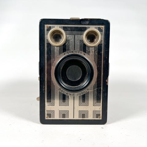 Vintage Kodak Brownie Junior Six-16 box camera produced by the Eastman Kodak Company in the 1930s (c. 1933–1940). This classic Art Deco–era Brownie features a fixed meniscus lens, rotary shutter, dual brilliant viewfinders for portrait and landscape shooting, and a textured black body with geometric front plate design.