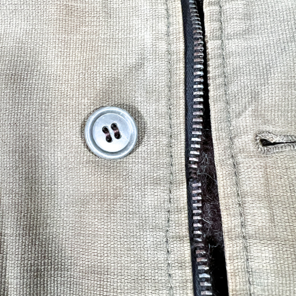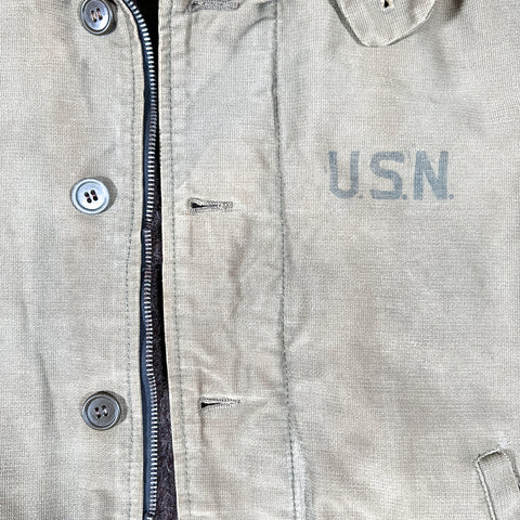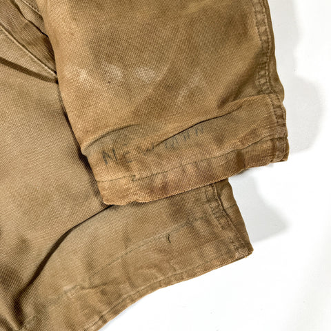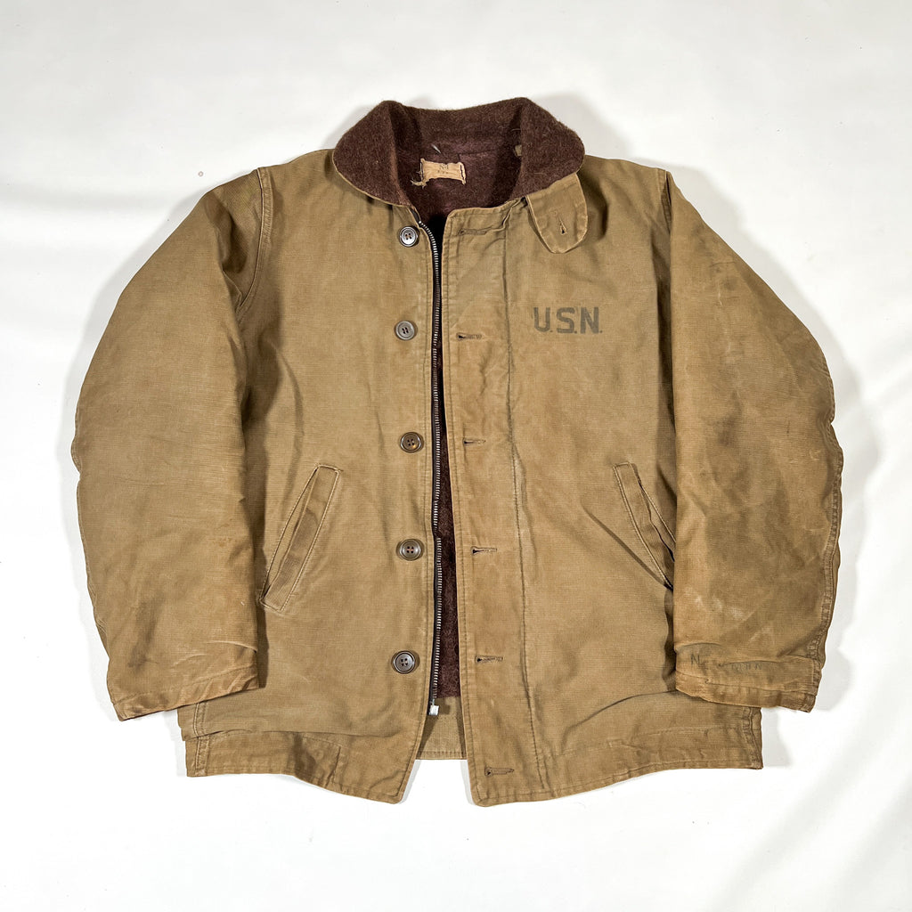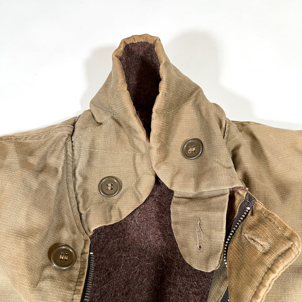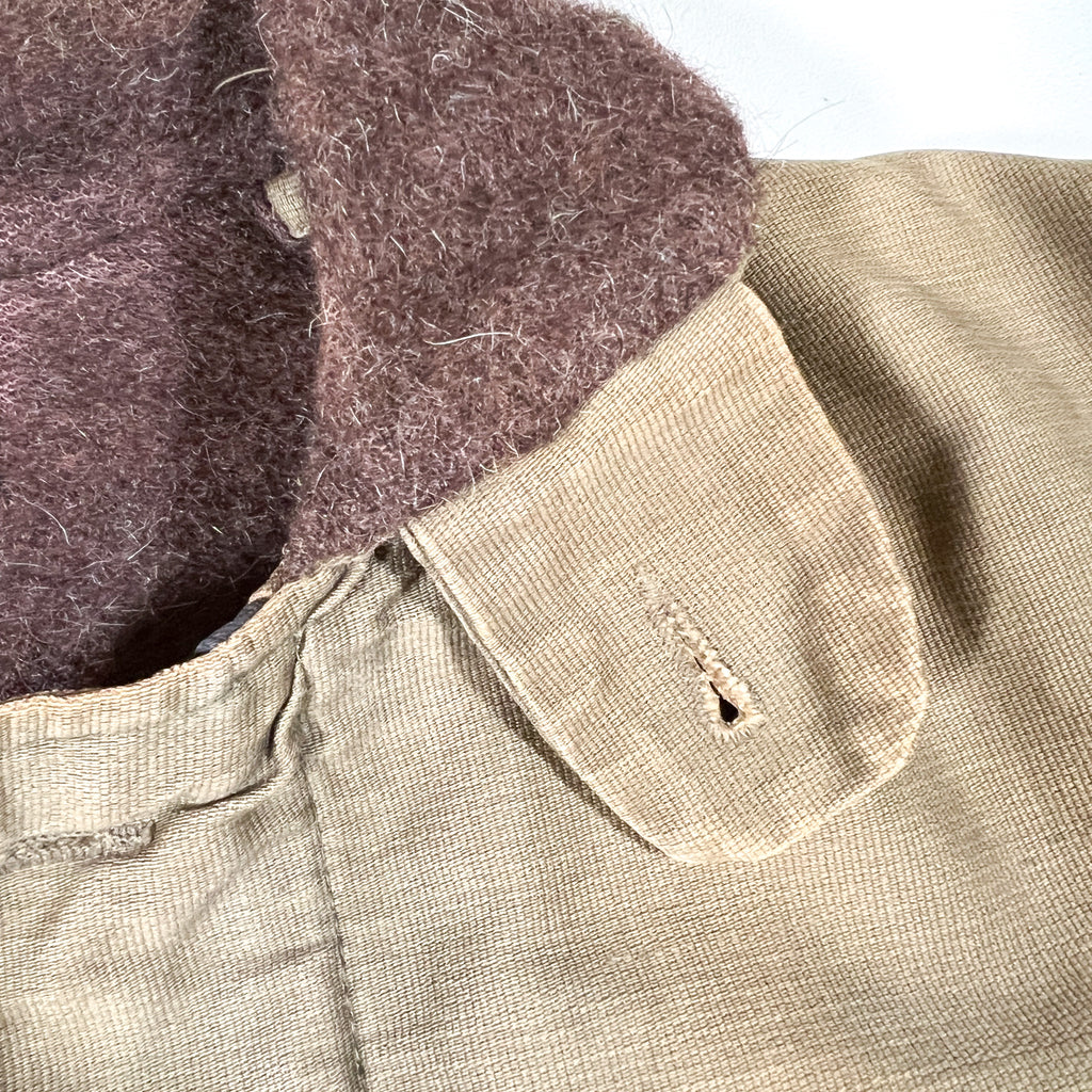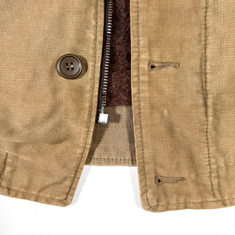Crafted from a khaki Bedford cord (jungle cloth) outer shell and lined with thick brown alpaca-style wool pile, this jacket features a “U.S.N.” chest stencil, angled hand-warmer pockets, and a button-front storm flap over a nonfunctional zipper (zipper slider missing, track missing teeth). Buttons are mismatched, and the cuff bears the name “NEWMAN” hand-marked from a previous owner — an authentic touch that adds to its story and vintage charm.