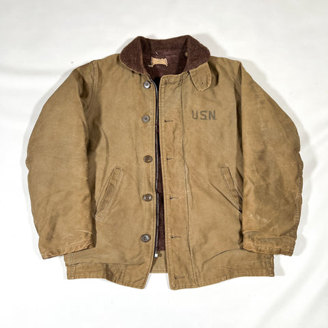 The neck tag reads “N-1 Type”, confirming this as a civilian-market interpretation of the classic U.S. Navy deck coat. Perfect for collectors, restorers, or heritage-wear enthusiasts who appreciate original, timeworn outerwear with history and character.