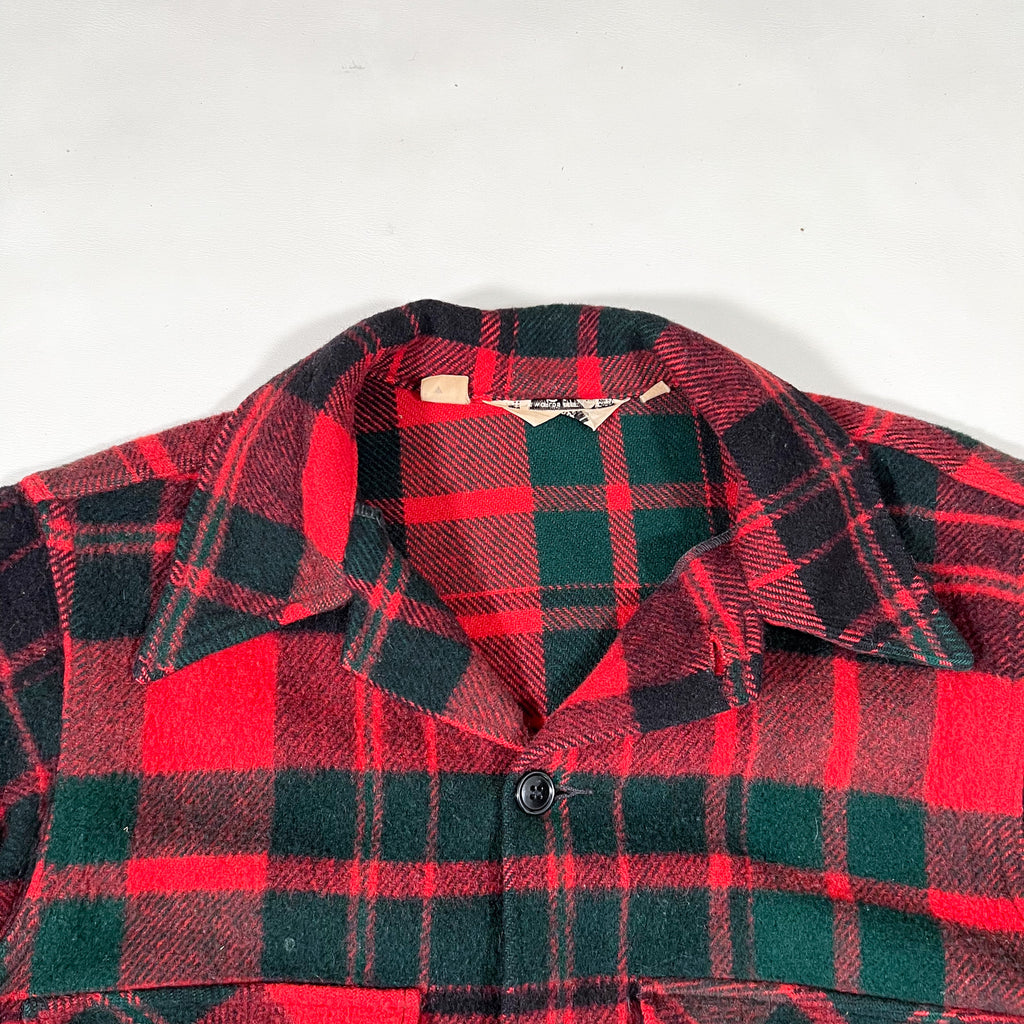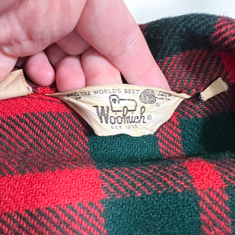 Classic vintage Woolrich wool jacket featuring a bold red, green, and black plaid pattern. This piece dates to the 1960s and showcases the brand’s iconic heavy wool construction, originally designed for warmth and durability in outdoor use.
