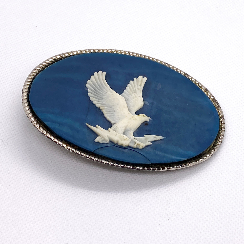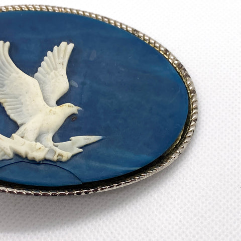 Vintage 1970s oval belt buckle featuring a carved white eagle set into a rich blue Incolay stone background. The eagle is rendered in raised relief with detailed feather carving, giving the piece strong depth and classic Western presence. Finished with a twisted rope-style silver-tone border.