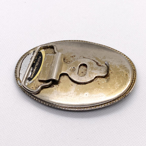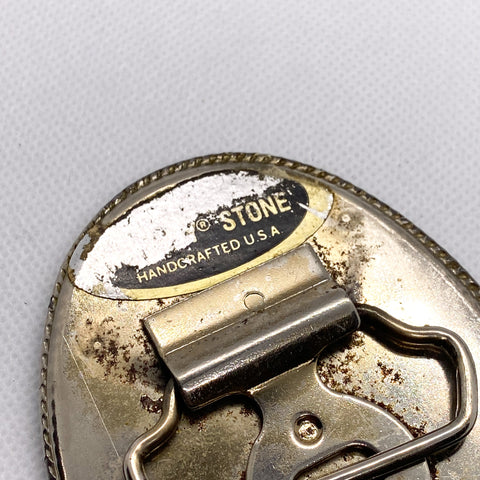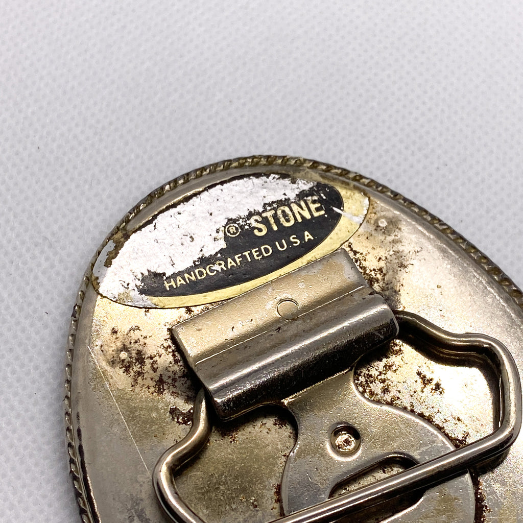 Back is marked “INCOLAY STONE – Handcrafted U.S.A.”, a maker label commonly seen on mid-century American buckles using Incolay stone panels. Measures approximately 3.75" x 2.75". Solid construction with good weight. Hardware is intact and functional.