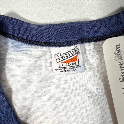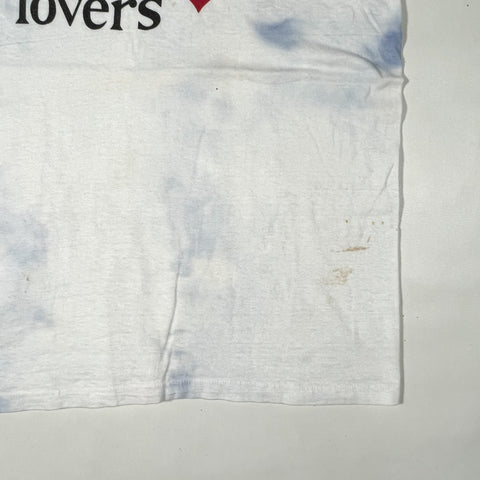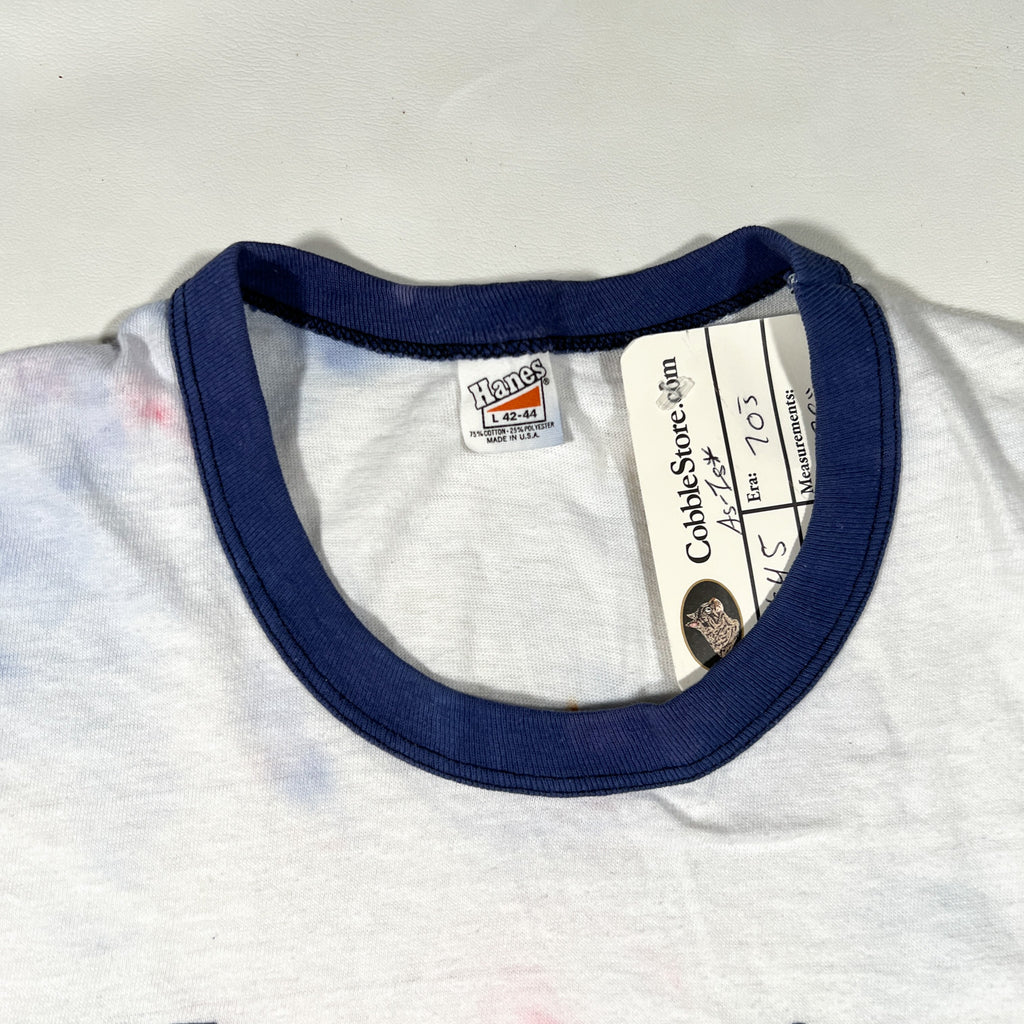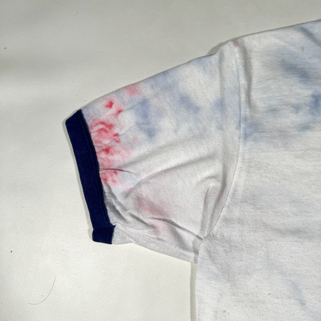 This shirt is sold as-is and shows color bleeding throughout the body and sleeves, giving it a subtle tie-dye style look. There are also light discoloration marks consistent with age and wear. Still very wearable and visually interesting, especially if you’re into unique one-of-one fade and dye patterns that only happen naturally over decades.