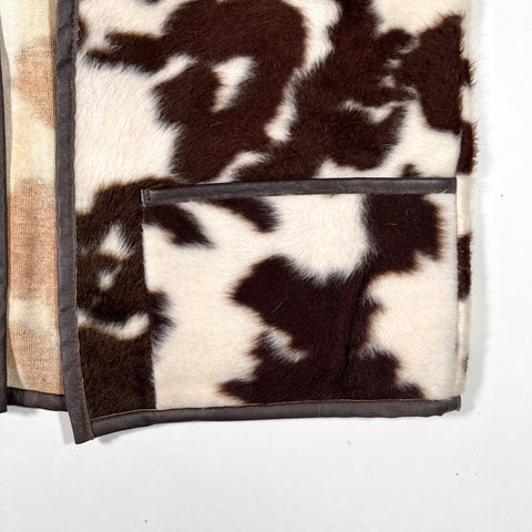 Unique vintage 70’s DeWan “Bush Country” faux cowhide fleece vest featuring a bold brown and cream cow print pattern. Soft, plush exterior with faux-leather style trim along the edges and roomy front pockets. A great Western-inspired statement piece that layers easily over flannels, knits, and denim.