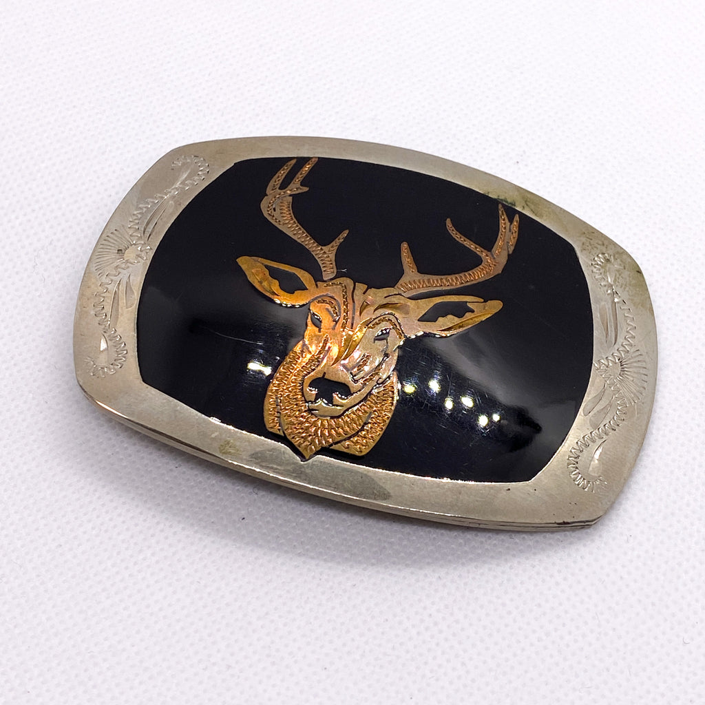 Striking vintage western-style belt buckle featuring a raised stag head design in gold-tone over a glossy black enamel background. The contrast between the black field and the detailed deer head gives this piece a bold, classic western look that pairs perfectly with denim, boots, and heritage fits.