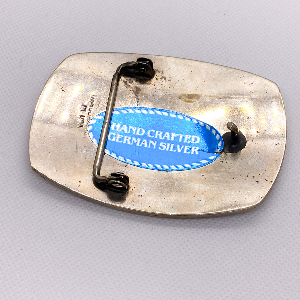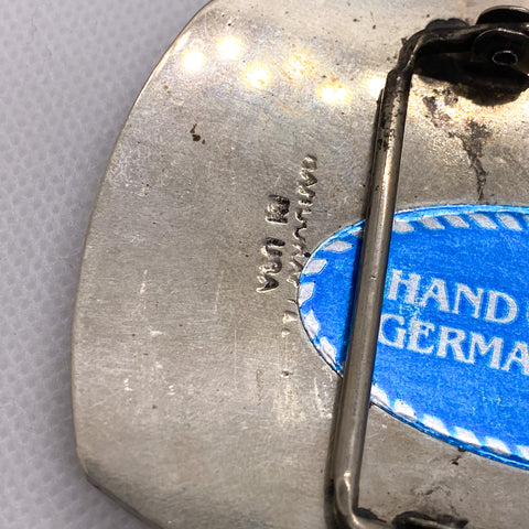 The back is stamped “USA” and “Germany Silver,” with an original blue label reading “Handcrafted German Silver,” indicating traditional alpaca/nickel silver style metalwork commonly used in western buckles. Solid construction with engraved scrollwork along the border adds extra detail and craftsmanship.