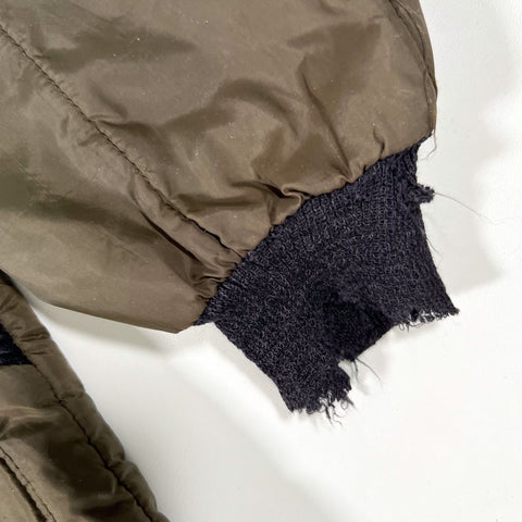 Shows fading throughout the shell, a cut inner tag, and fraying/damage on the sleeve cuffs. General wear consistent with age. Still fully wearable and structurally solid.