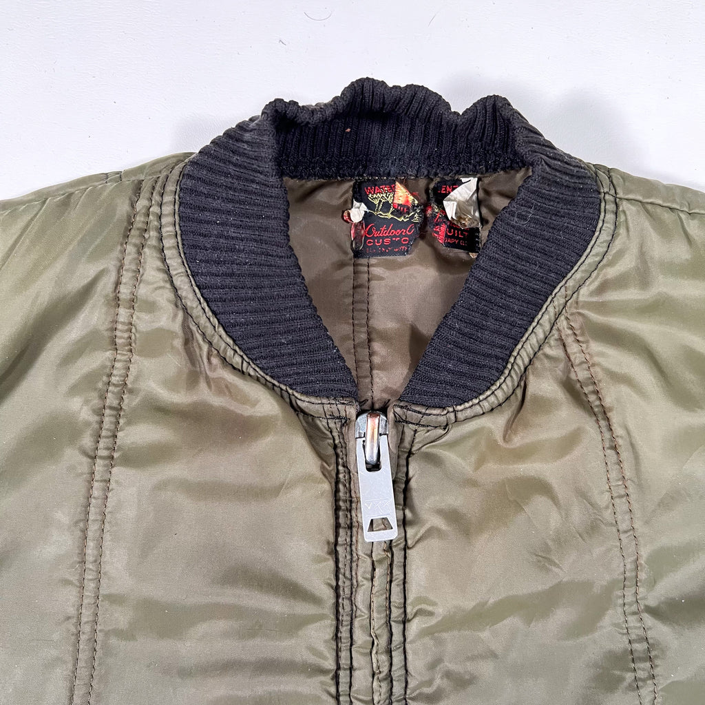 Vintage 70’s Outdoor Adventures quilted jacket featuring a classic olive/army green shell, black ribbed knit collar, and distinctive ribbed side panels. Tag reads Water Repellent and Custom Built (care tag is partially cut). Built with a heavy-duty YKK zipper and a long, easy-to-layer fit. A great piece of old-school outdoor workwear style.