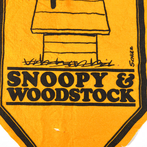 The banner is made from thin printed felt with a house-shaped silhouette and illustrated Snoopy and Woodstock perched on Snoopy’s doghouse. The artwork style, typography, and construction are consistent with licensed Peanuts wall hangings produced in the 1970s.