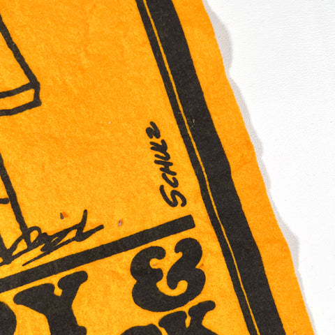 This piece shows honest vintage wear, including moth holes, edge wear, and light thinning throughout the felt. Graphics remain legible and visually strong despite age-related flaws. Please review photos carefully to assess condition—this is a true survivor piece and priced accordingly.