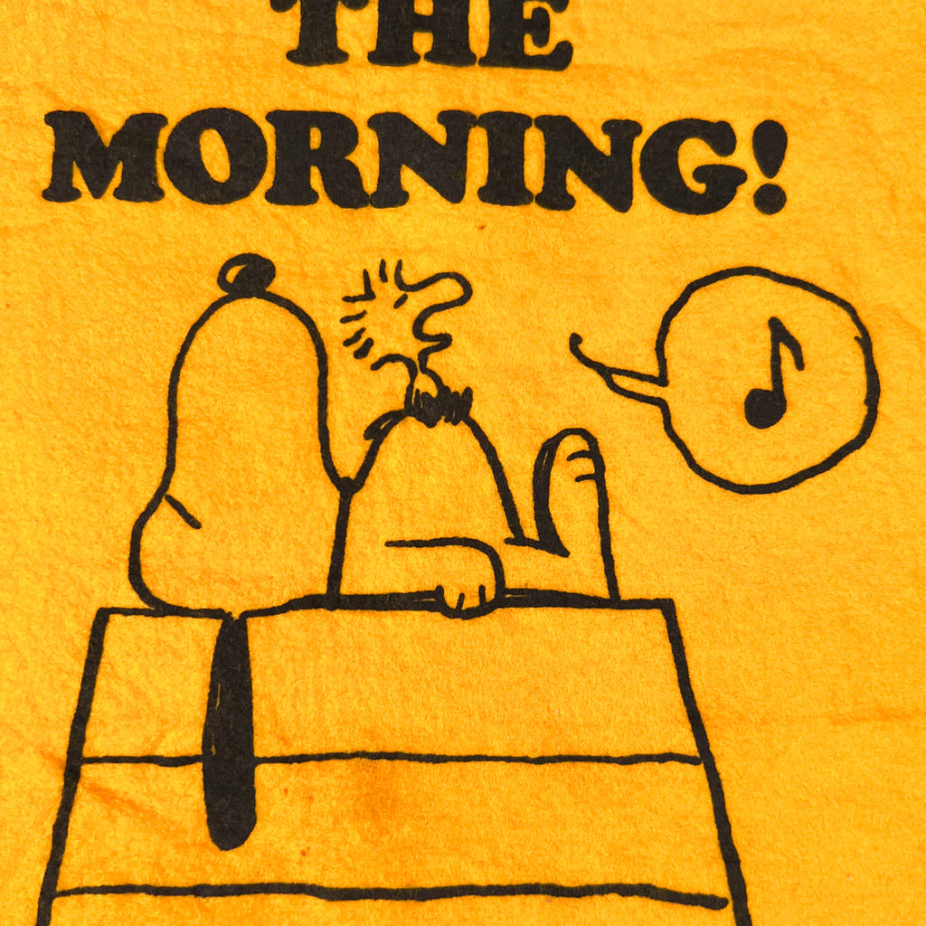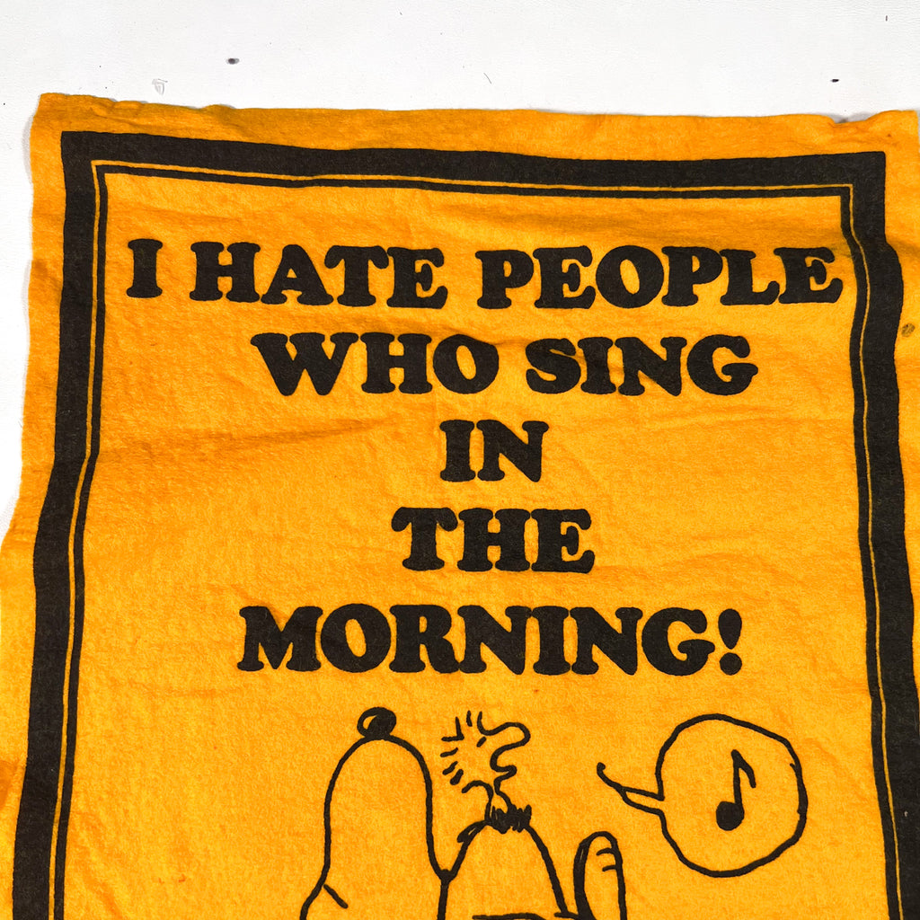 Original vintage Snoopy & Woodstock felt wall banner, likely dating to the 1970s, featuring a bold orange felt background with black graphics and text reading “I Hate People Who Sing in the Morning!” A classic Peanuts-era novelty piece with strong counterculture humor that fits perfectly into vintage cartoon, dorm, or record-room decor.