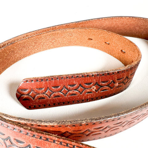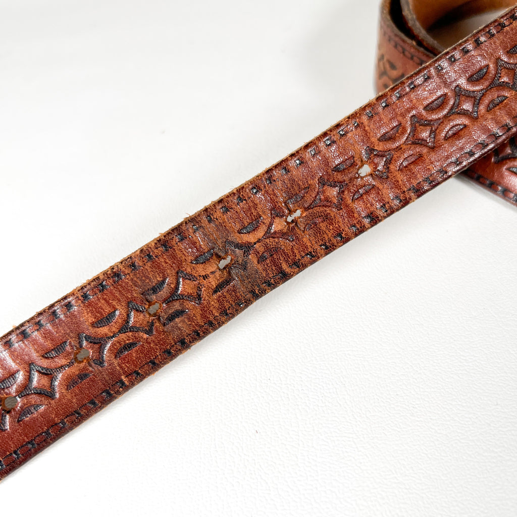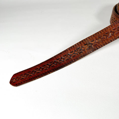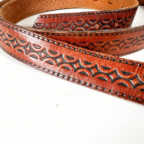 Classic vintage 1970s tooled leather belt featuring a repeating geometric half-moon and diamond pattern in rich chestnut brown with black detailing. The intricate tooling gives it a bold mid-century Western look while remaining versatile enough for modern wear.