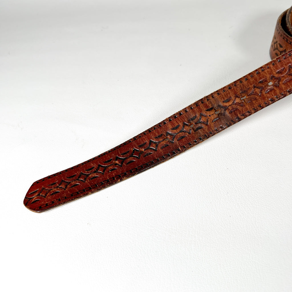 70s leather belt, vintage western belt, geometric tooled belt, brown leather snap belt, handmade leather belt, cowboy style, vintage Americana accessories, 1970s fashion, boho belt