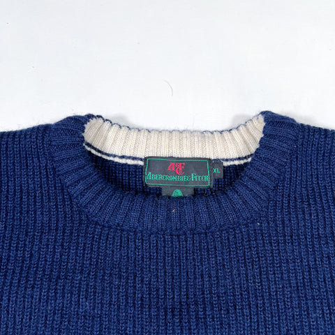 Vintage 80’s Abercrombie & Fitch heavyweight wool sweater featuring a navy body with cream contrast paneling across the chest and sleeves. Rib-knit texture throughout, classic crew neckline with contrast trim, and embroidered collegiate-style crest on the front. Made from 100% pure wool — warm, durable, and perfect for cold-weather layering.