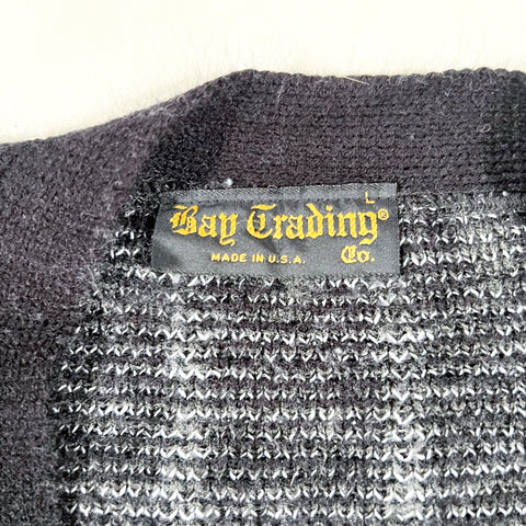 Classic 1980s Bay Trading Co. cardigan made in the USA, featuring a minimalist vertical stripe knit pattern in shades of charcoal and gray. The textured knit and tonal palette give it a timeless, slightly dressy look that layers well over a tee or button-up.