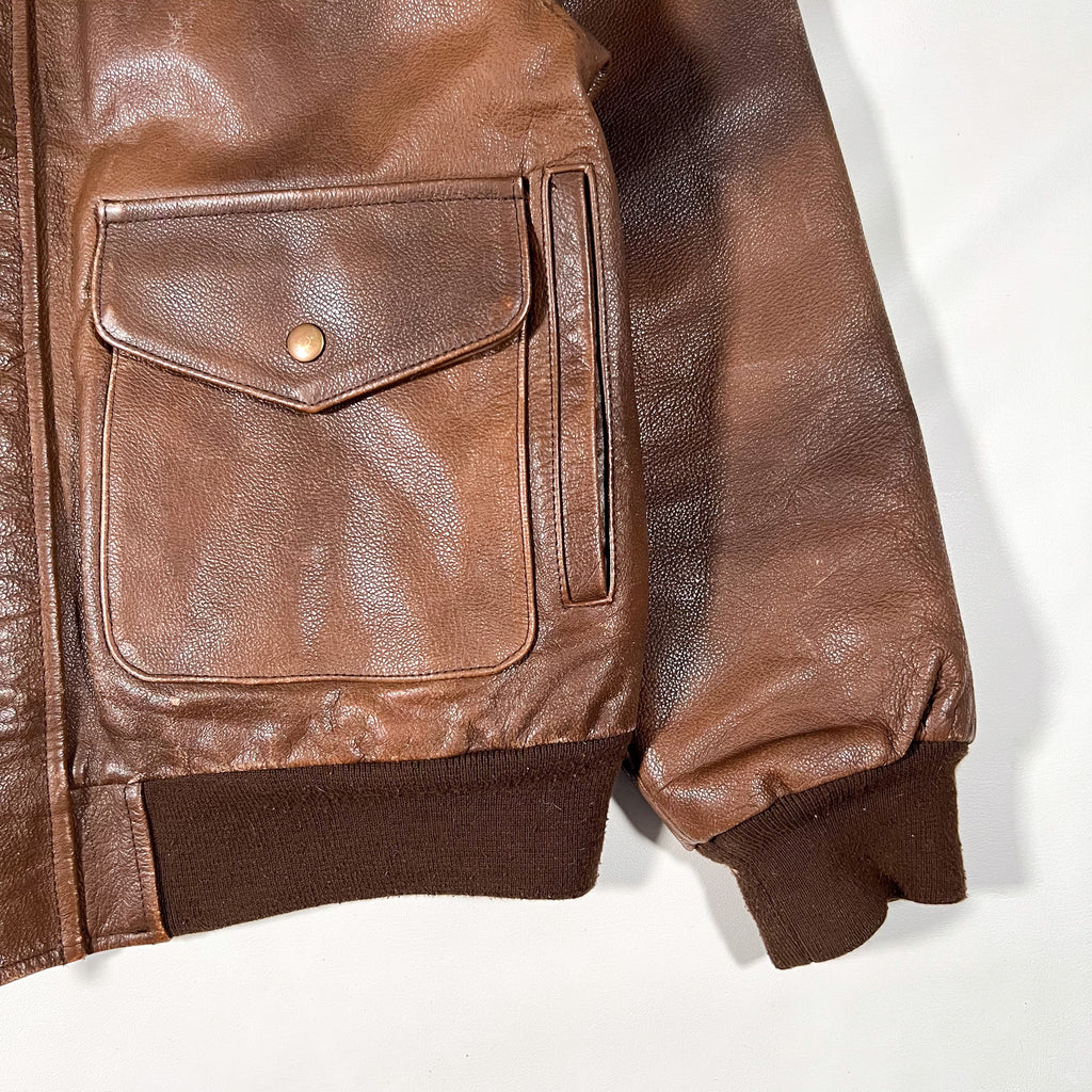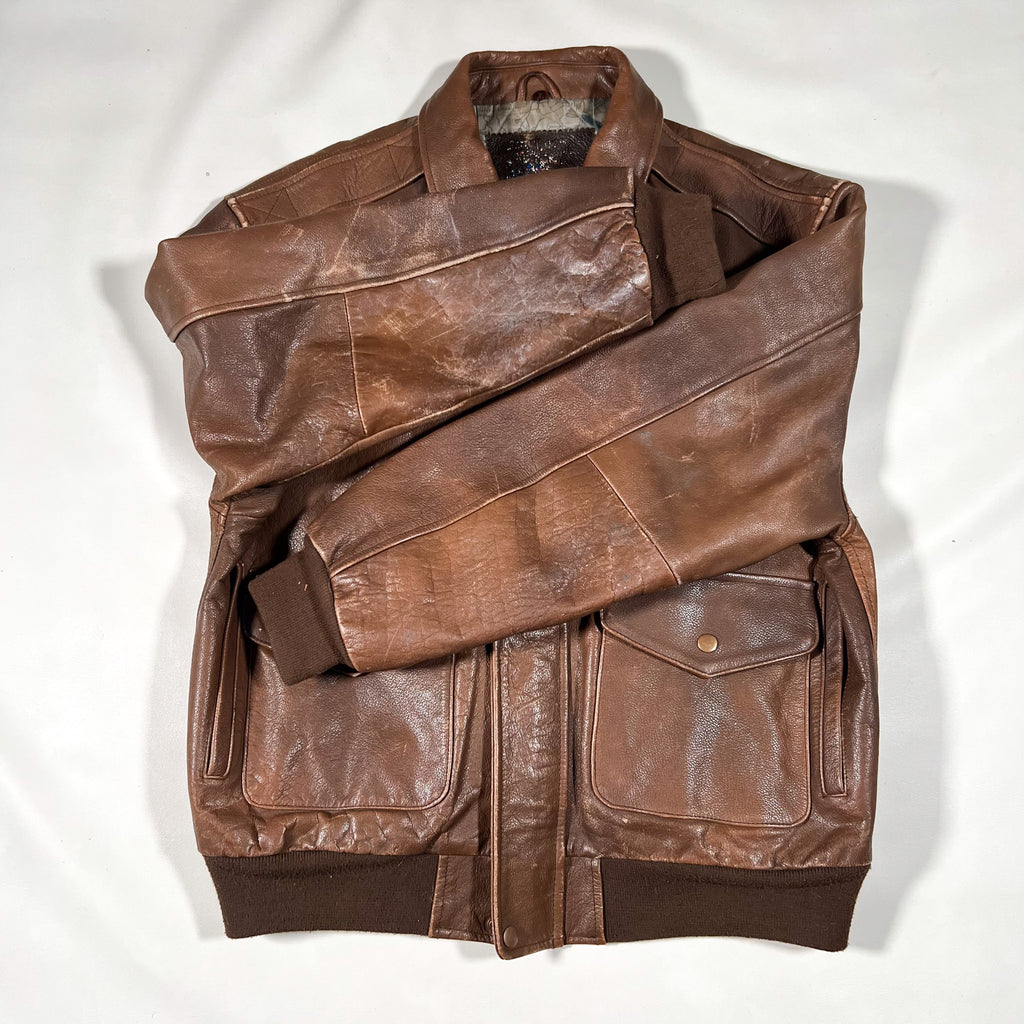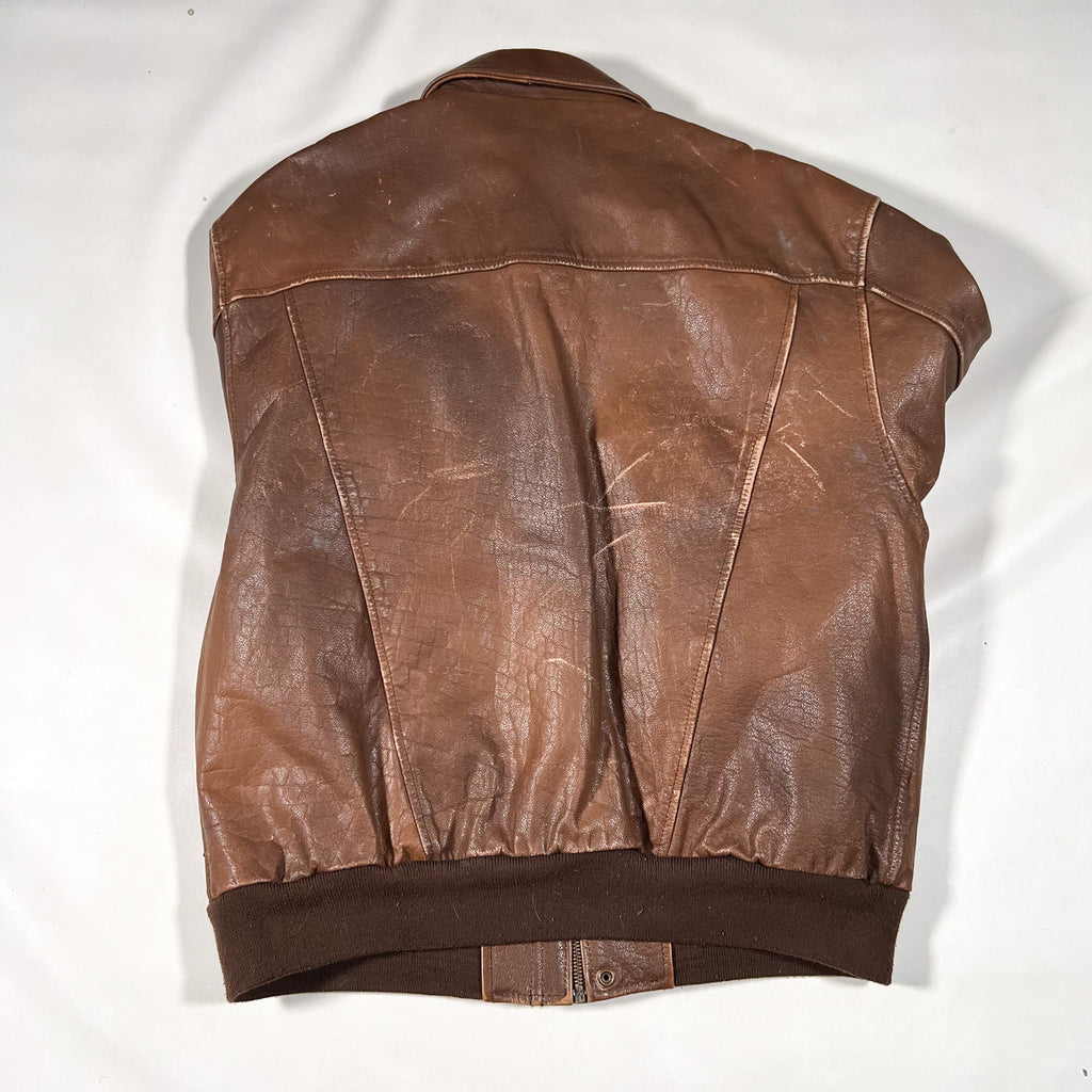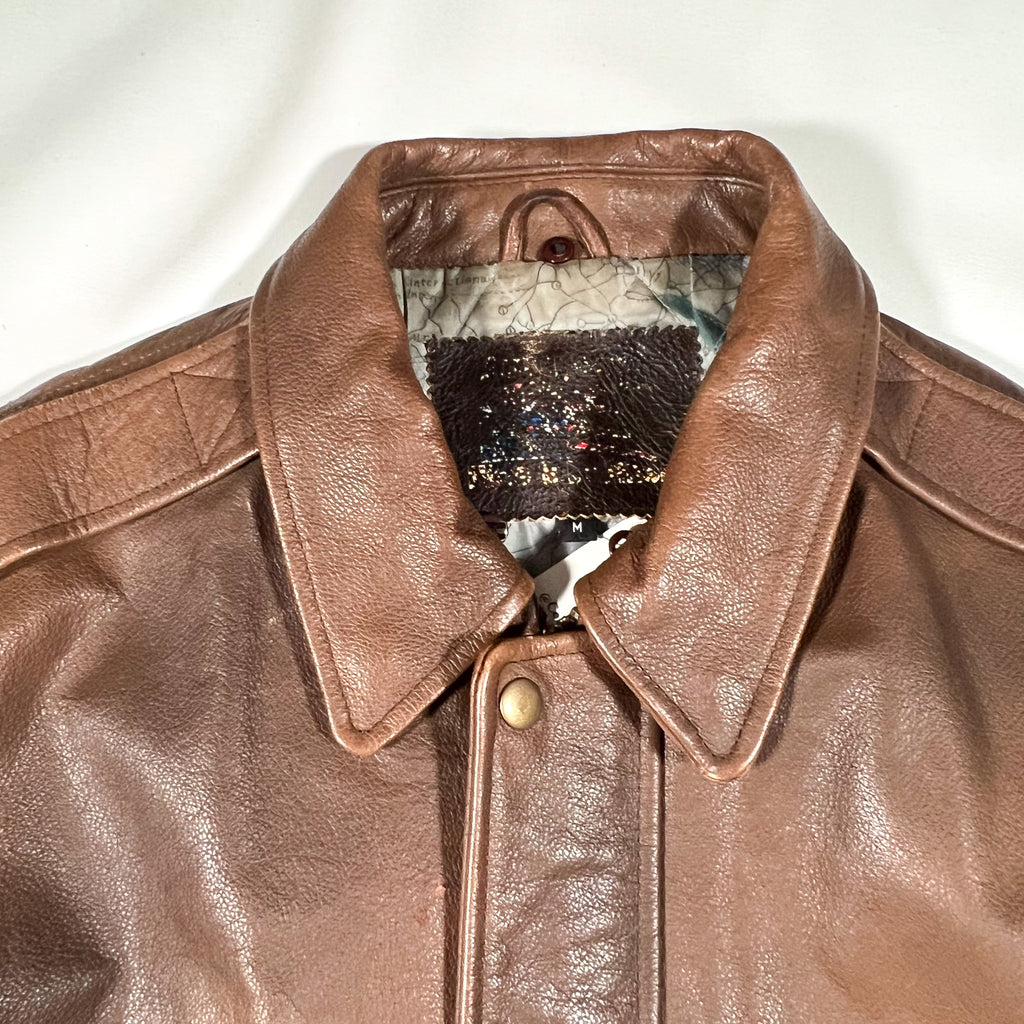 Timeless and rugged — this vintage 1980s brown leather flight jacket channels classic aviator style with its cropped fit and substantial leather shell. Features a pointed collar, dual front flap pockets with brass snaps, ribbed cuffs and waistband, and a map-print interior lining for a touch of character.