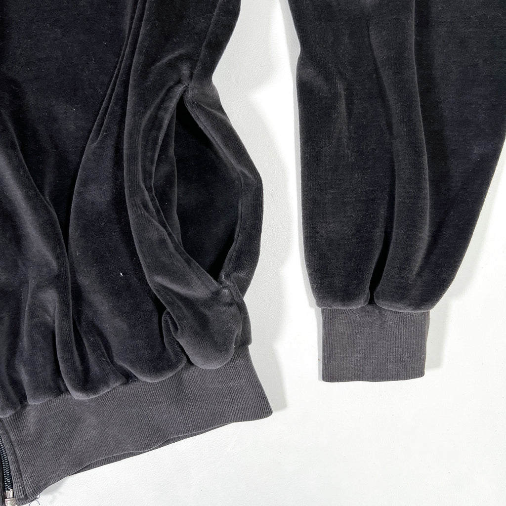 Smooth, bold, and unmistakably 1980s — this Countess Mara velour track jacket brings a refined twist to classic athletic wear. Crafted in plush black velour with striking red contrast panels across the shoulders and chest, it features a full-zip front, ribbed cuffs and hem, and subtle tonal side pockets. The iconic Countess Mara crown-and-monogram logo is embroidered on the left chest for a signature touch.