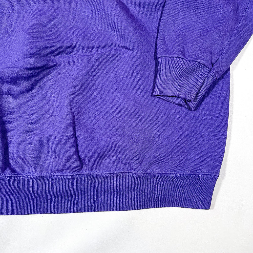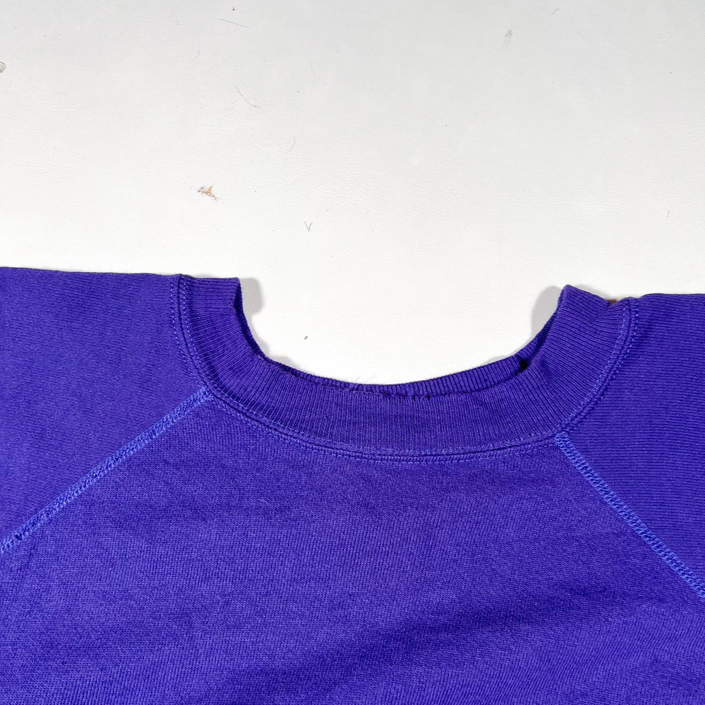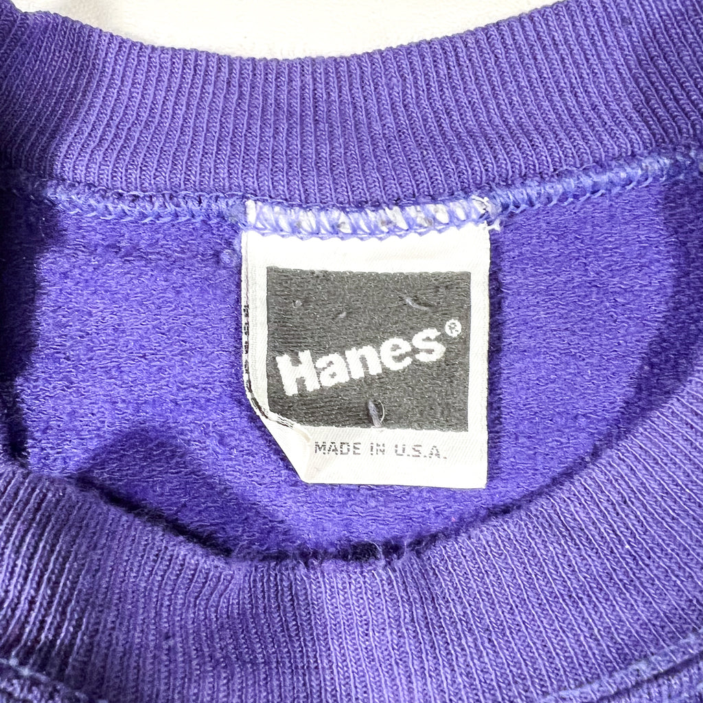 Vintage 1980s Hanes crewneck sweatshirt in a rich purple color, made in the USA. Features classic 80s construction with raglan sleeves, a traditional ribbed crewneck collar, ribbed cuffs, and ribbed hem. Constructed from soft yet durable fleece with a brushed interior, offering the comfortable broken-in feel vintage Hanes sweatshirts are known for.