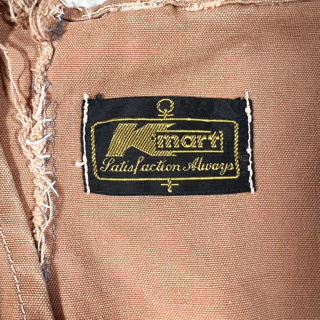 Classic 1980’s Kmart canvas hunting vest with all the utilitarian details you’d expect from the era. Rugged tan canvas front with dual large flap pockets, elastic ammo loops, and a suede-feel shooting pad on the left chest. Back features an oversized game pouch in a contrasting olive nylon. Broken-in patina throughout with small marks, fraying at the collar seam, and general wear consistent with use. Tagged Kmart Satisfaction Always.