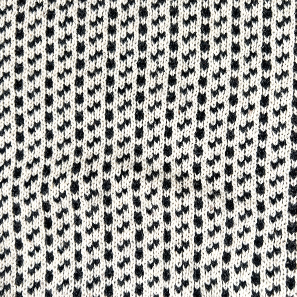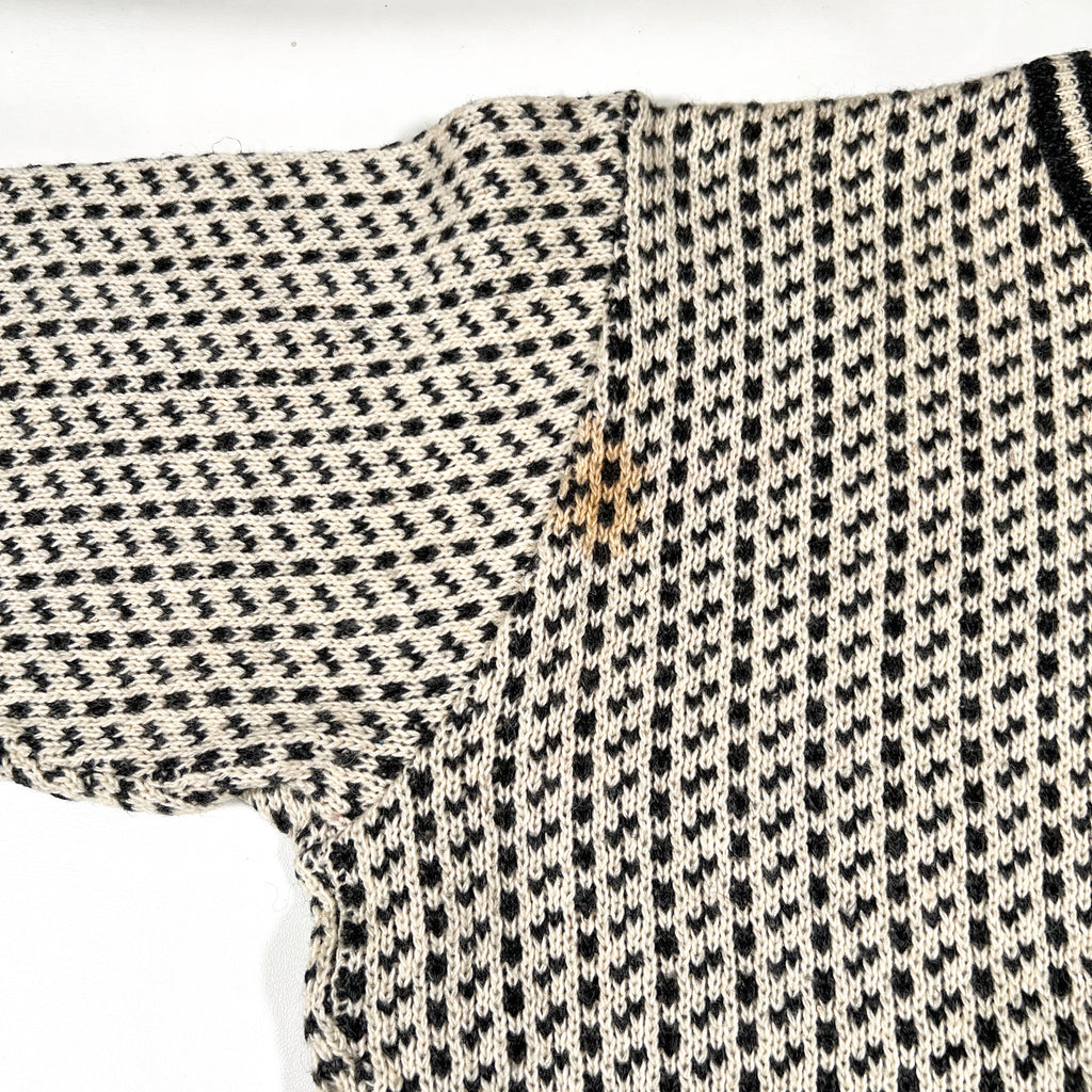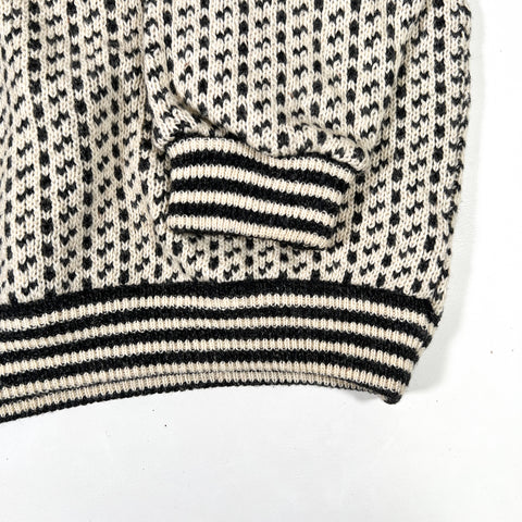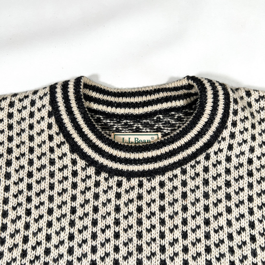 The sweater features a cream and black bird’s-eye pattern throughout, complemented by striped rib-knit trim at the collar, cuffs, and hem. A hallmark of quality from L.L. Bean’s golden era of imported knits, this piece embodies durable craftsmanship and classic design.