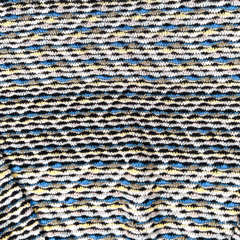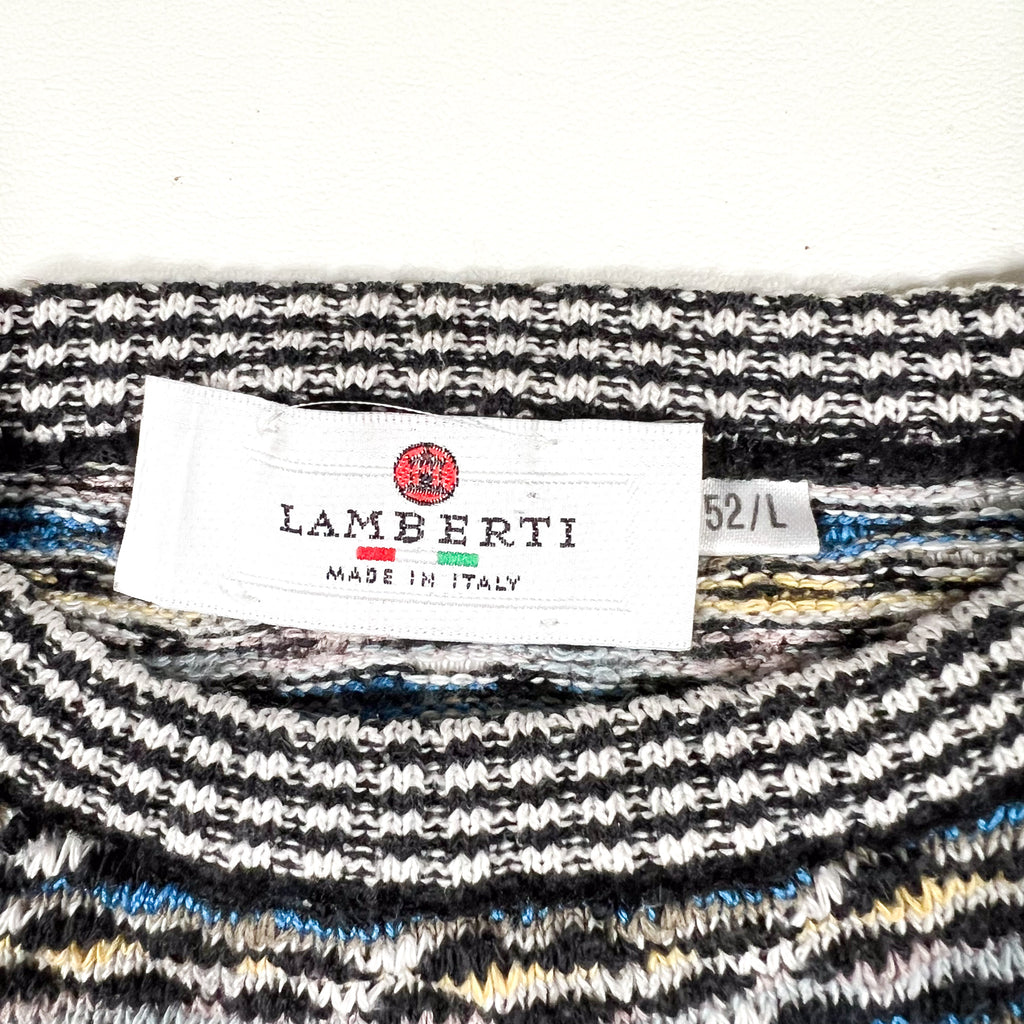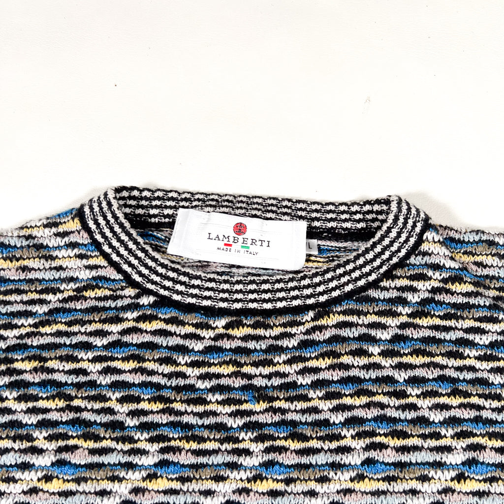Vintage 1980s Lamberti knit sweater, made in Italy. This piece features a dense, textured horizontal knit with a multicolor palette of black, white, blue, yellow, and muted earth tones throughout. Classic crewneck silhouette with ribbed collar, cuffs, and hem, giving it a clean but substantial feel.