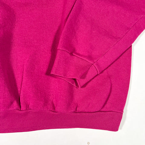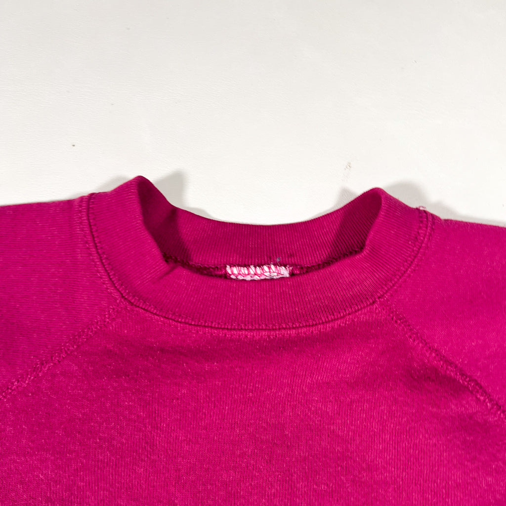 Vintage 1980s raglan crewneck sweatshirt in a rich magenta / fuchsia colorway. Features classic raglan sleeves, a soft fleece interior, and a boxy 80s silhouette with a slightly cropped body. The original tag has been cut, but construction, fabric weight, and stitching are consistent with 1980s American-made athletic blanks.