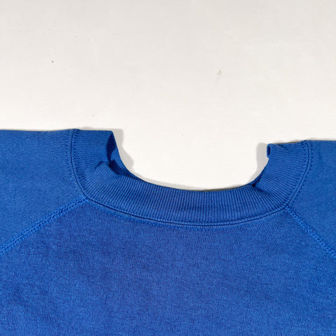 Vintage 1980s Pannill crewneck sweatshirt in a classic medium blue colorway. Made in the USA with a soft fleece interior, this piece features traditional raglan sleeves, ribbed collar, cuffs, and hem, and a boxy 80s silhouette. Pannill is well regarded for its durable blanks, commonly used for athletic, collegiate, and workwear sweatshirts during the era.