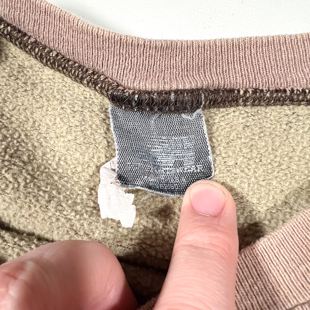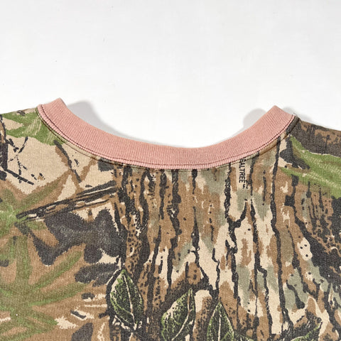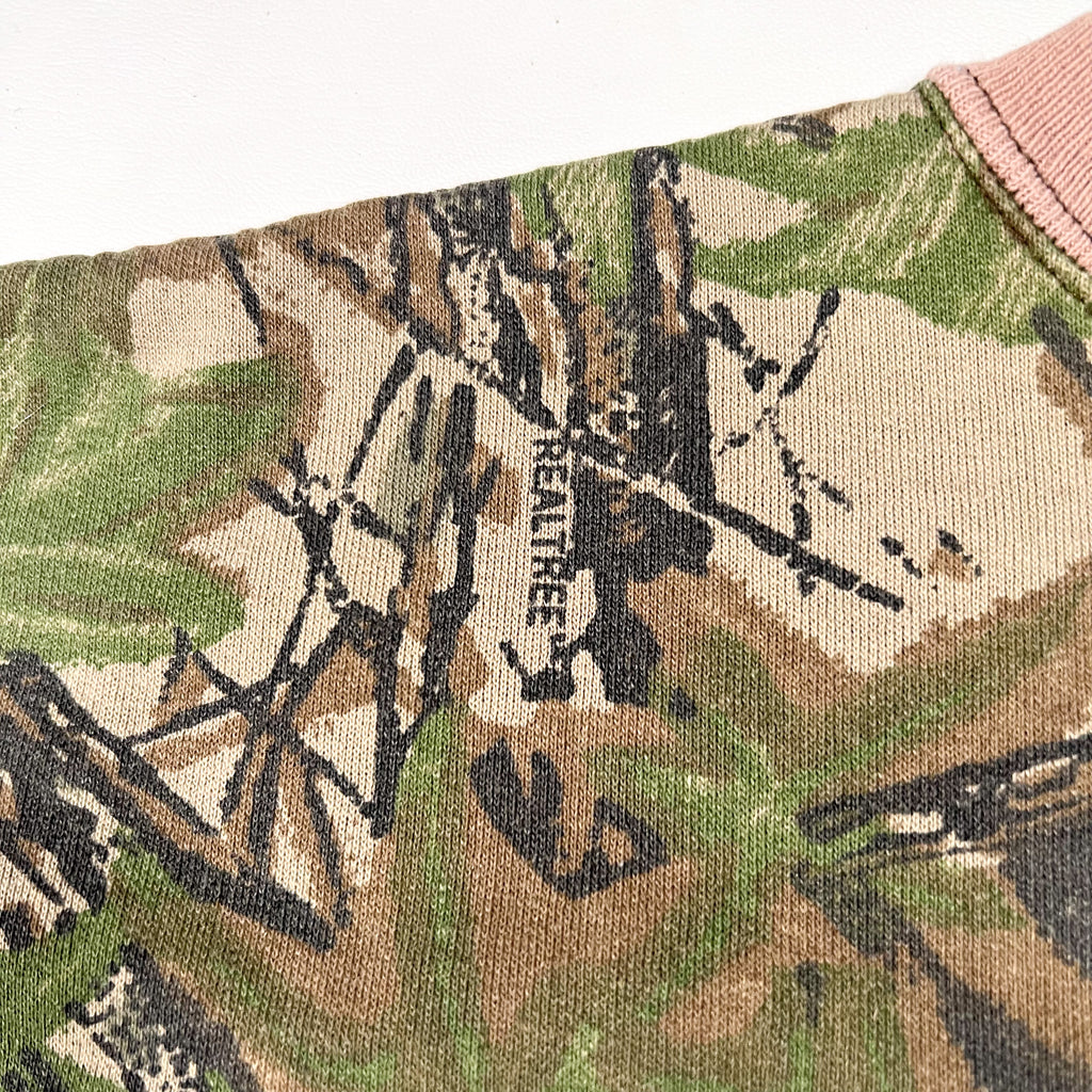 Vintage 1980’s Realtree camo crewneck with dusty rose ribbed cuffs, collar, and hem. Made in the USA and featuring a classic early Realtree woodland pattern with soft natural fading throughout. Midweight fleece interior with a slightly cropped body typical of 80’s fits. Light wear, minor marks on the waistband, but no major flaws.