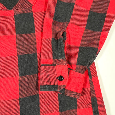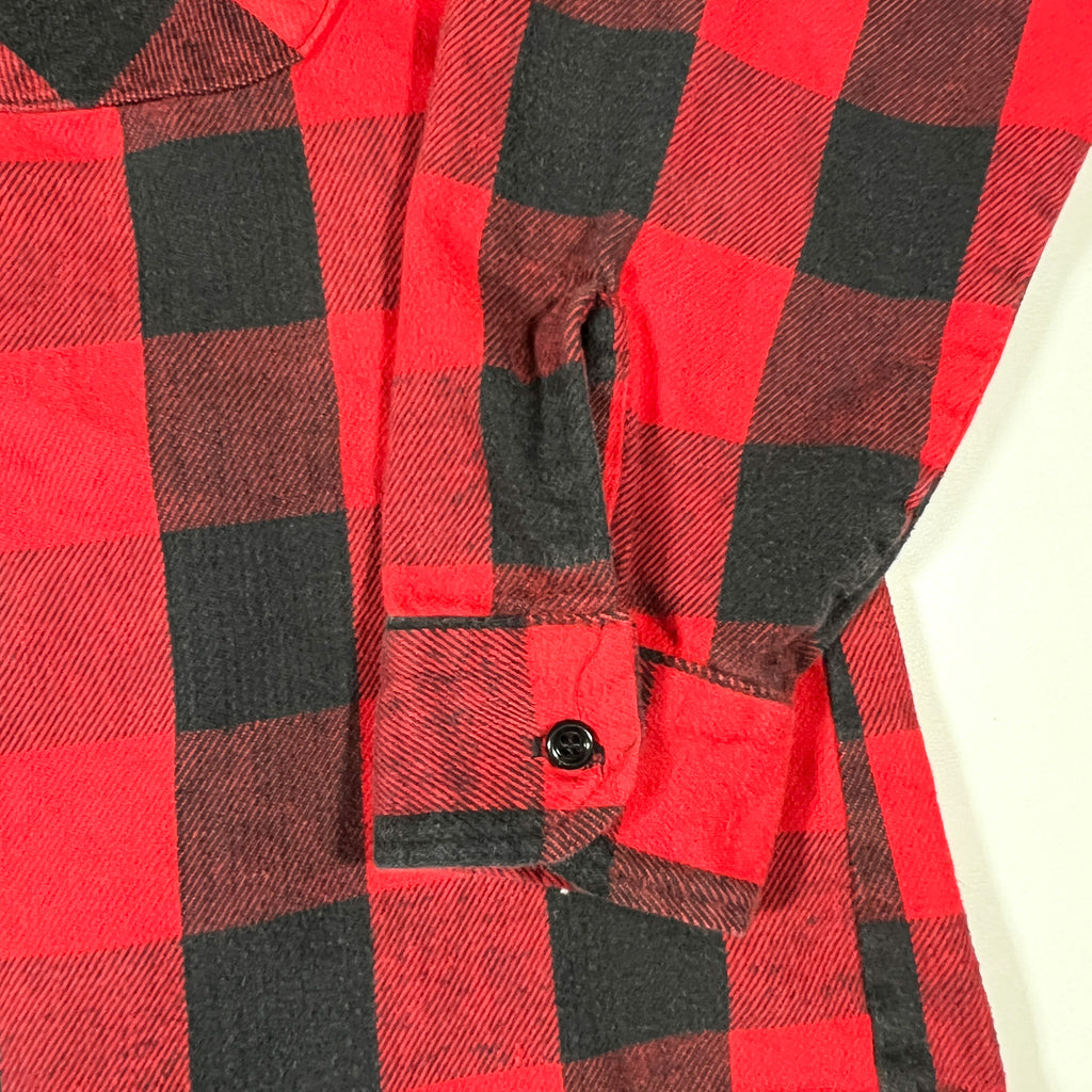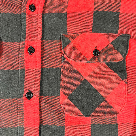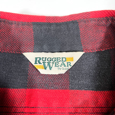 Classic 1980s Rugged Wear by Bond flannel shirt featuring the timeless red and black buffalo plaid pattern. Made from soft, heavyweight brushed cotton flannel with a traditional button-up front, dual chest pockets, and adjustable button cuffs.