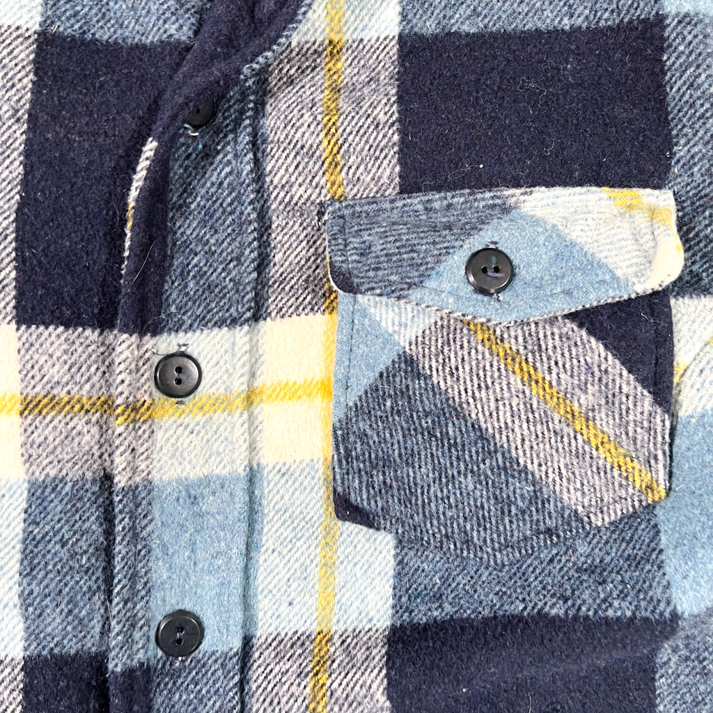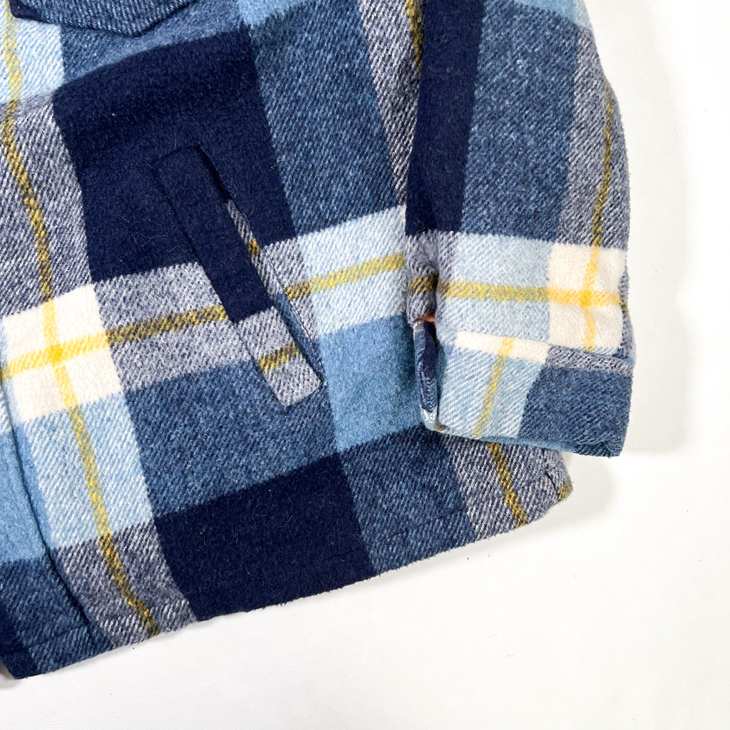 Warm, heavyweight 80’s Sears “The Men’s Store” outerwear shacket in a killer blue, navy, white, and yellow plaid. Fully fleece-lined for insulation with dual chest pockets, side hand pockets, and classic button-front closure. Marked 46 Tall and fits like a roomy modern XL.