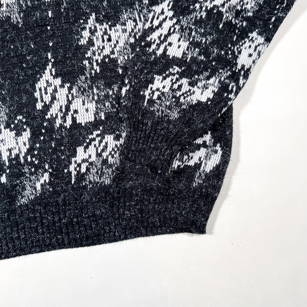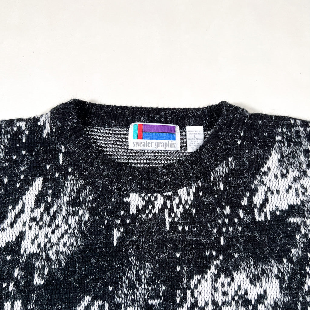 Classic 1980’s texture and pattern, this Sweater Graphix knit features a black, white, and gray abstract design with a fuzzy acrylic blend that gives it that true vintage look and feel. Made in Taiwan (R.O.C.) with a slightly boxy fit and ribbed cuffs/hem for a clean silhouette. A perfect cold-weather staple with that unmistakable 80’s graphic knit vibe.