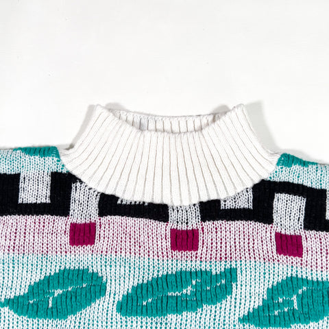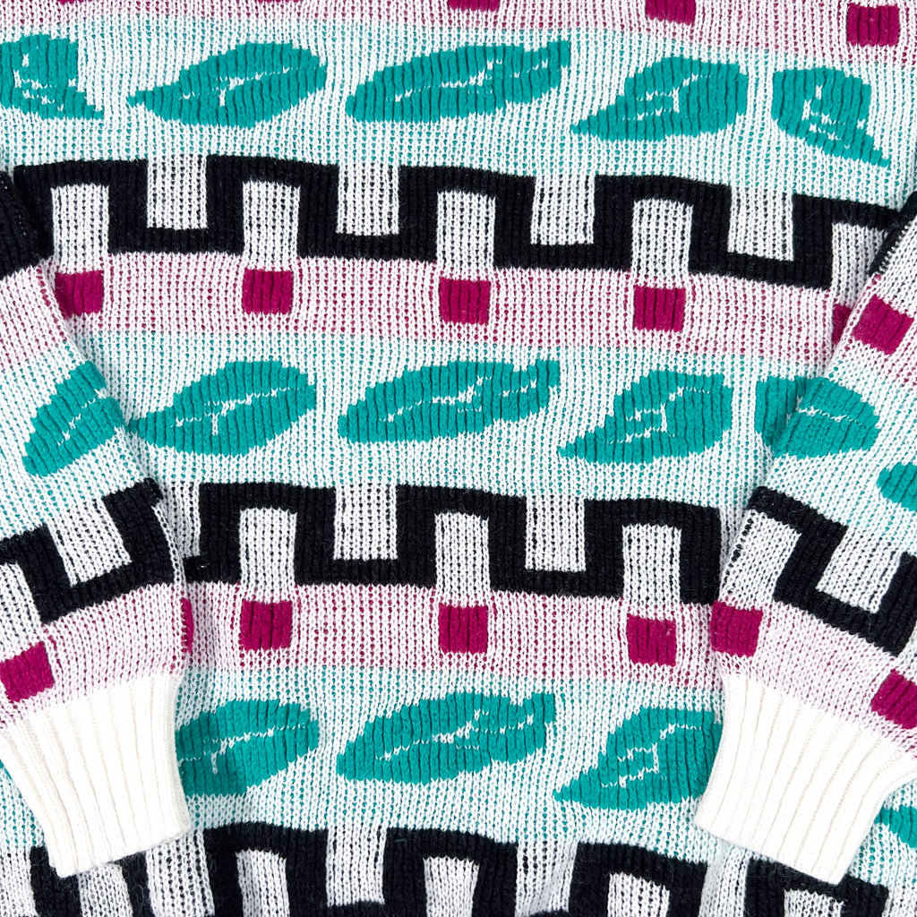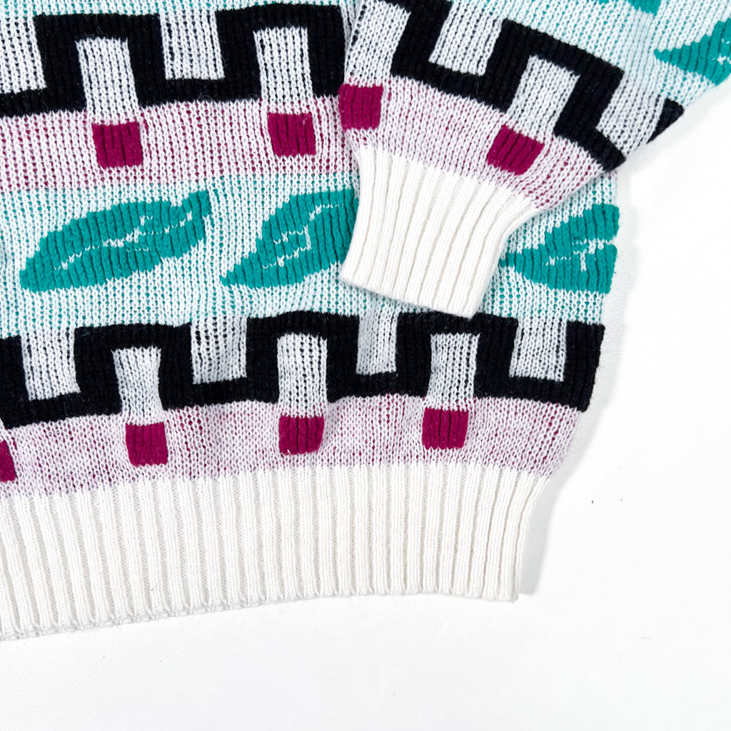 Vibrant and cozy vintage 1980s Teasers knit sweater featuring a bold abstract geometric pattern. The design includes teal feather-like shapes, black maze-style zigzags, and magenta accents on a soft white and pastel lavender base. Made with a chunky knit construction, ribbed crewneck, cuffs, and hem.