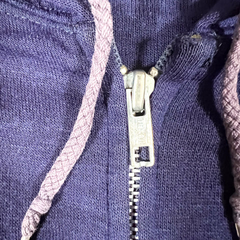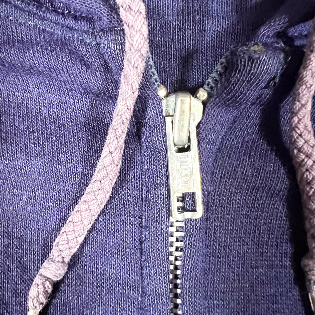 Vintage 1980s unbranded full-zip hoodie jacket in a deep purplish navy blue tone. Features a classic boxy 80s fit, soft fleece interior, ribbed cuffs and hem, and a solid metal PRIDE zipper, a well-known American zipper manufacturer commonly used on quality garments of the era. Finished with braided drawstrings and a clean, minimal blank design.