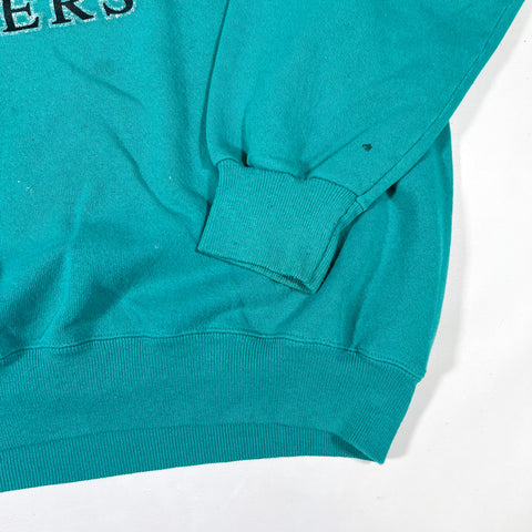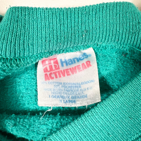 Unique vintage 1980s Burkhart Dancers crewneck in a bold teal colorway with an eye-catching graphic of three dancers mid-step. Classic 80’s Hanes Activewear construction with a soft fleece interior and ribbed cuffs and hem.