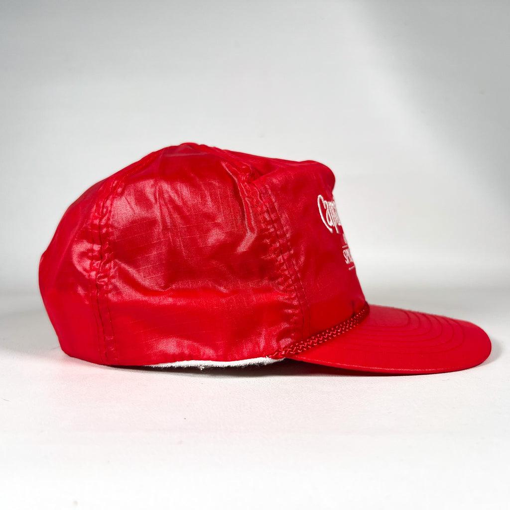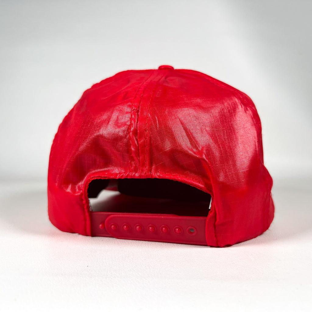 Bold vintage Captain Morgan snapback featuring embroidered “Captain Morgan Original Spiced Rum” lettering on a bright red nylon crown. Classic rope detail across the brim gives this hat a very strong 1980s–1990s barwear and liquor promo look.