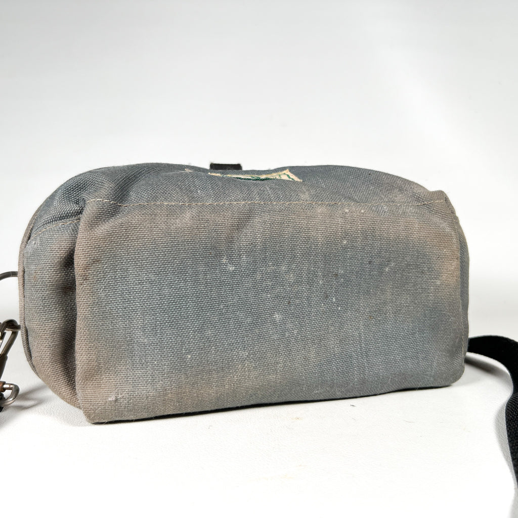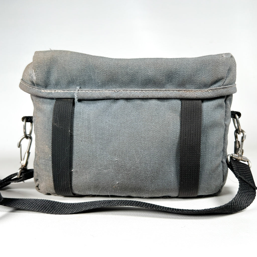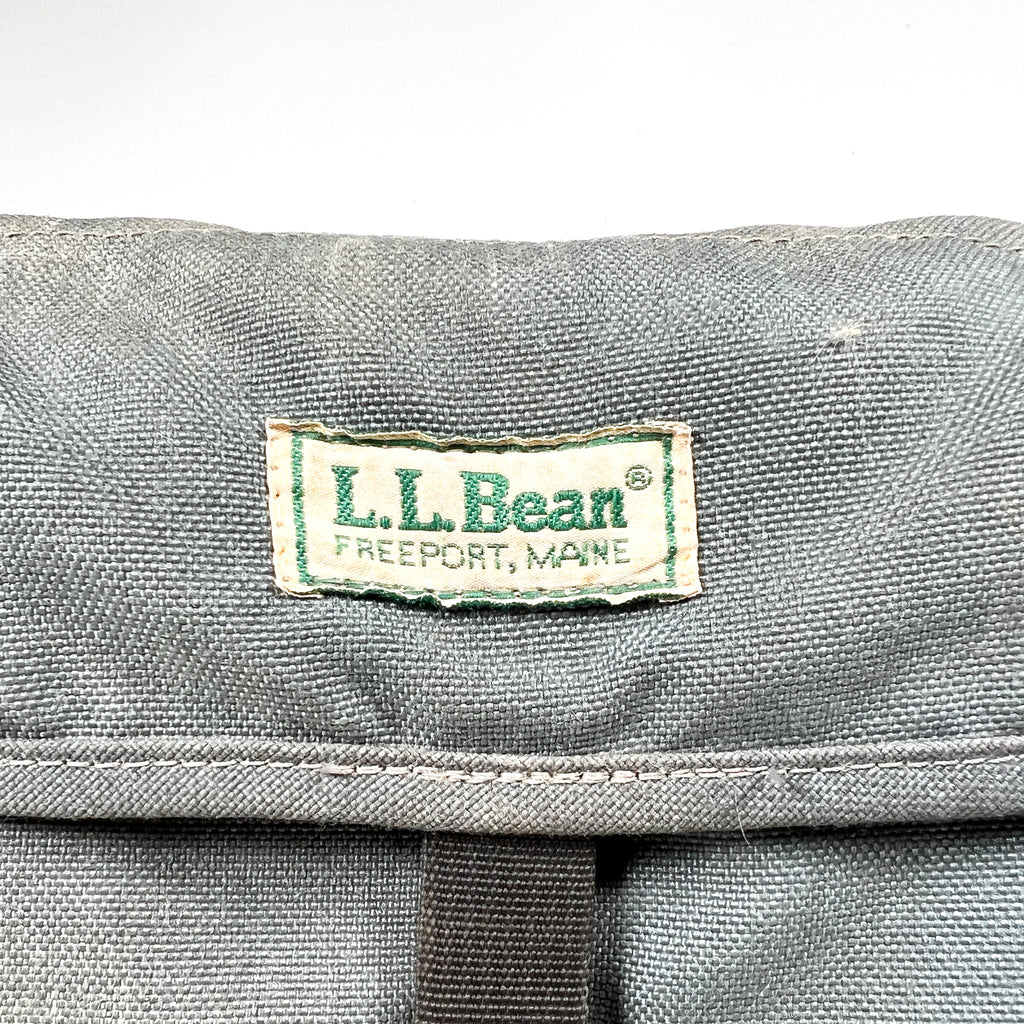 Authentic vintage L.L. Bean camera bag from the 1980s in classic gray canvas with original “L.L. Bean Freeport, Maine” patch on the flap. This compact shoulder bag features two main zip compartments, an interior with four elastic film canister holders, and one removable padded divider to help organize a camera body, lens, and accessories. Adjustable shoulder strap with metal hardware and front buckle closure.