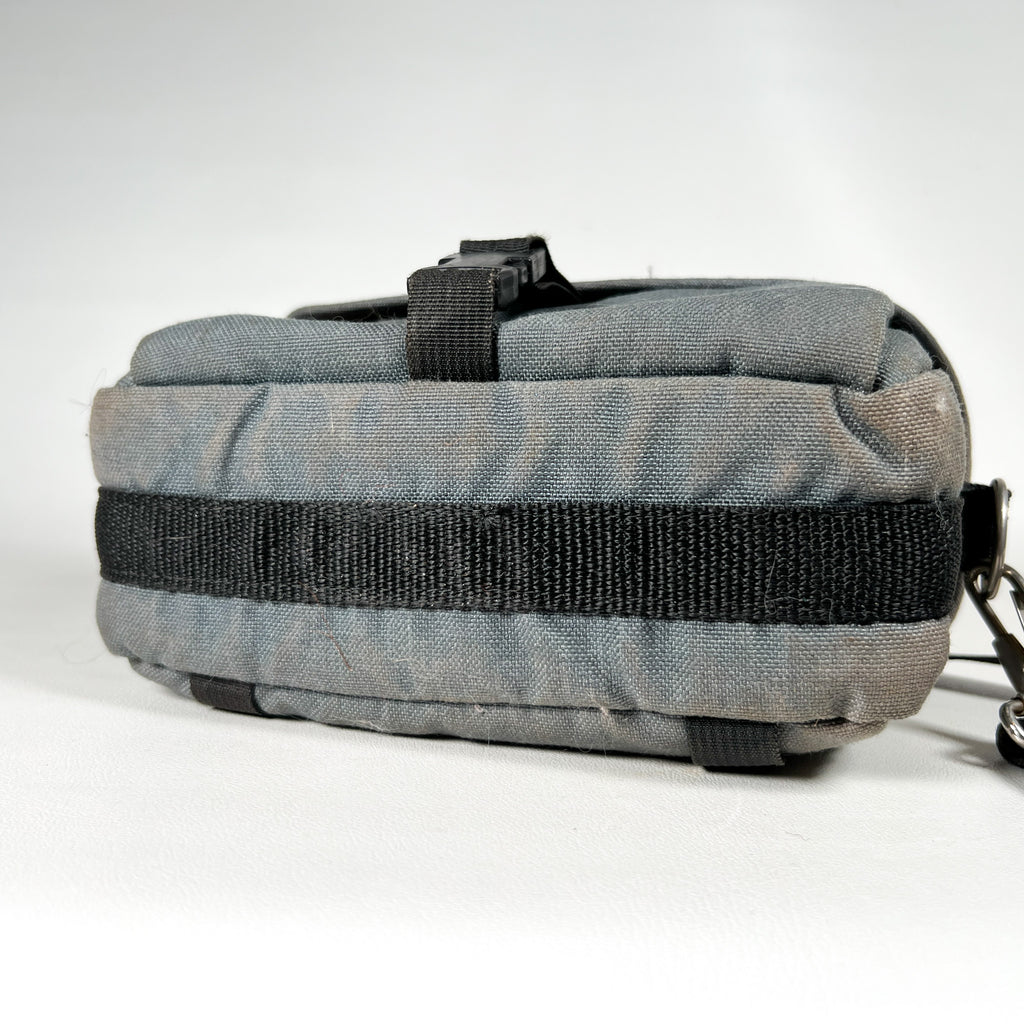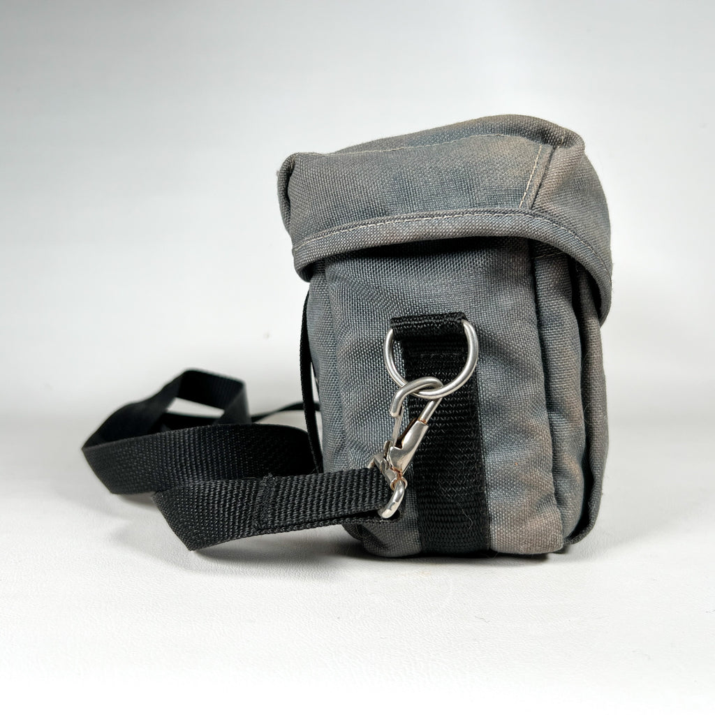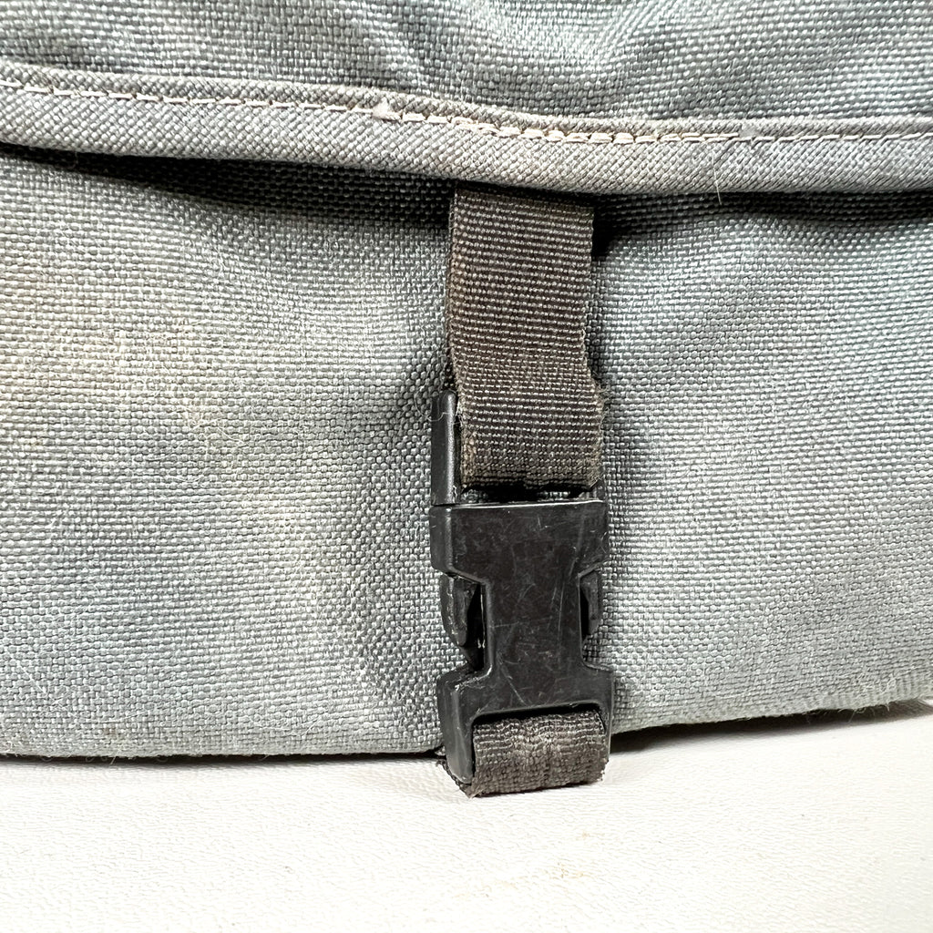 Authentic vintage L.L. Bean camera bag from the 1980s in classic gray canvas with original “L.L. Bean Freeport, Maine” patch on the flap. This compact shoulder bag features two main zip compartments, an interior with four elastic film canister holders, and one removable padded divider to help organize a camera body, lens, and accessories. Adjustable shoulder strap with metal hardware and front buckle closure.