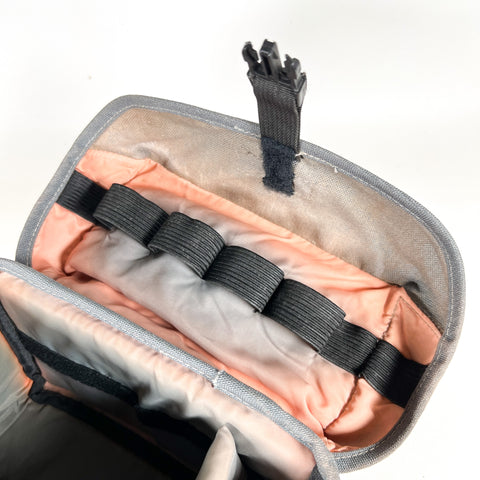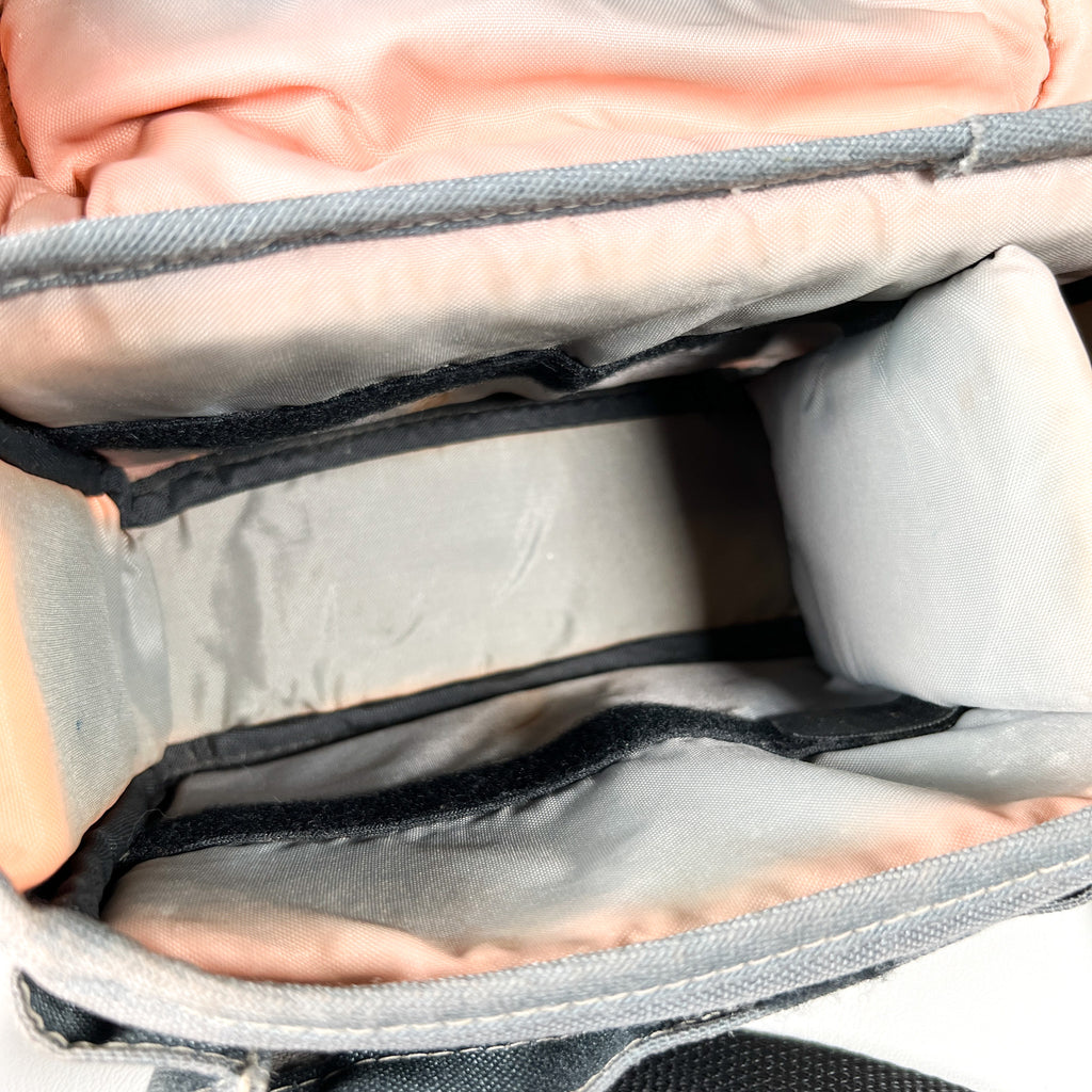 This bag shows visible fading, staining, and wear throughout consistent with heavy use and age, giving it a great worn-in vintage patina. The interior padding and compartments are intact and functional. Zippers and hardware function properly. Sold as-is due to cosmetic wear and fading. Please review photos closely for exact condition.
