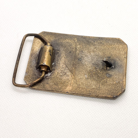 The front shows natural wear and patina, with darker recessed areas and softened high points from age and use. The back is unmarked and fitted with a standard hook and prong closure. Overall condition is consistent with a vintage advertising buckle that was meant to be worn.
