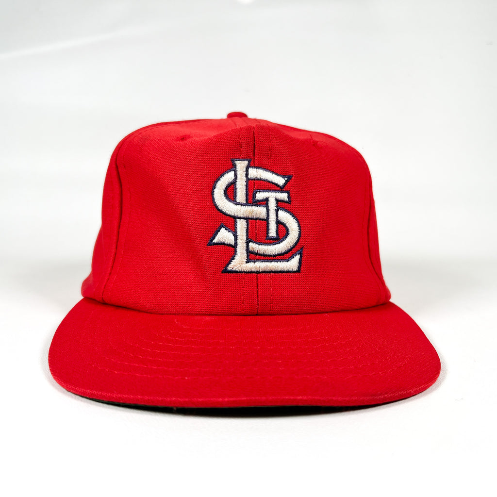 Classic 1980s St. Louis Cardinals snapback hat featuring the bold interlocking “STL” logo embroidered on the front. Made by Sports Specialties, this authentic Made in Taiwan cap captures the vintage MLB look with a red wool-blend crown, green undervisor, and structured 6-panel fit.