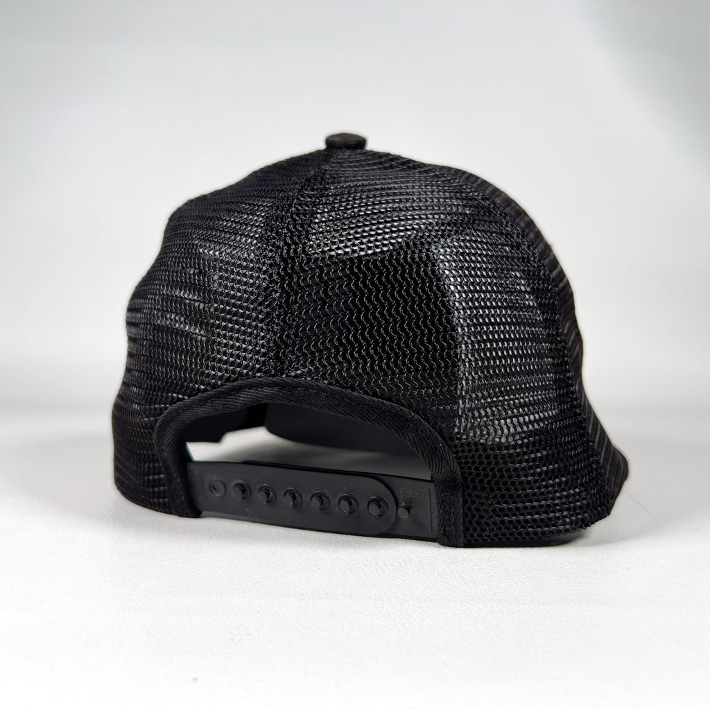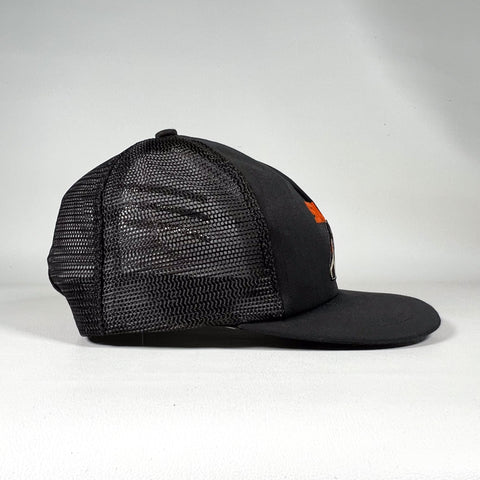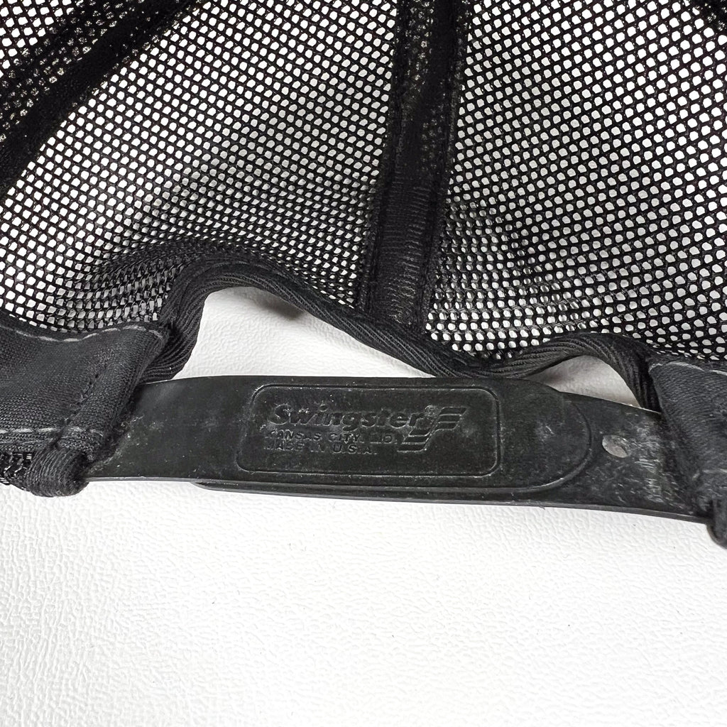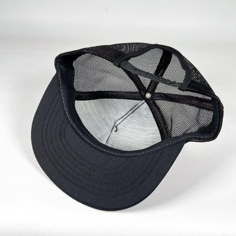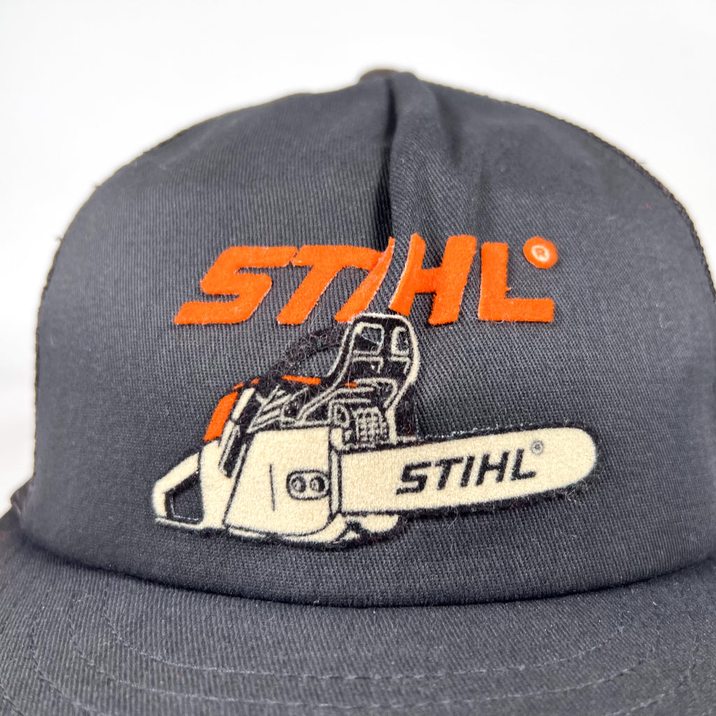 Vintage black STIHL mesh trucker hat with raised embroidered logo and flocked velvet-texture chainsaw graphic patch across the front — a standout detail rarely seen in modern promotional hats. Made in the USA by Swingster, known for durable workwear and classic mesh trucker styles. Adjustable snapback closure for a custom fit.