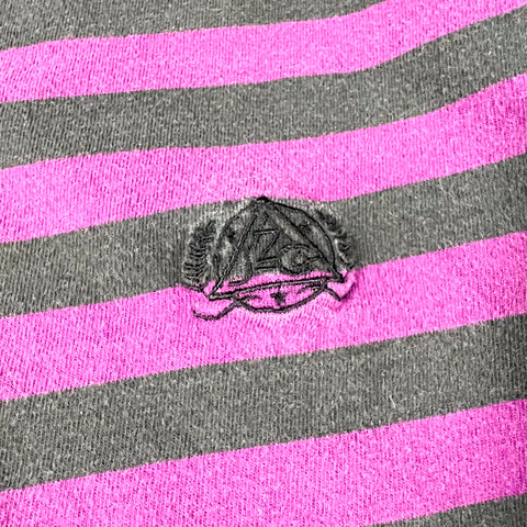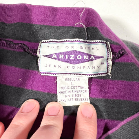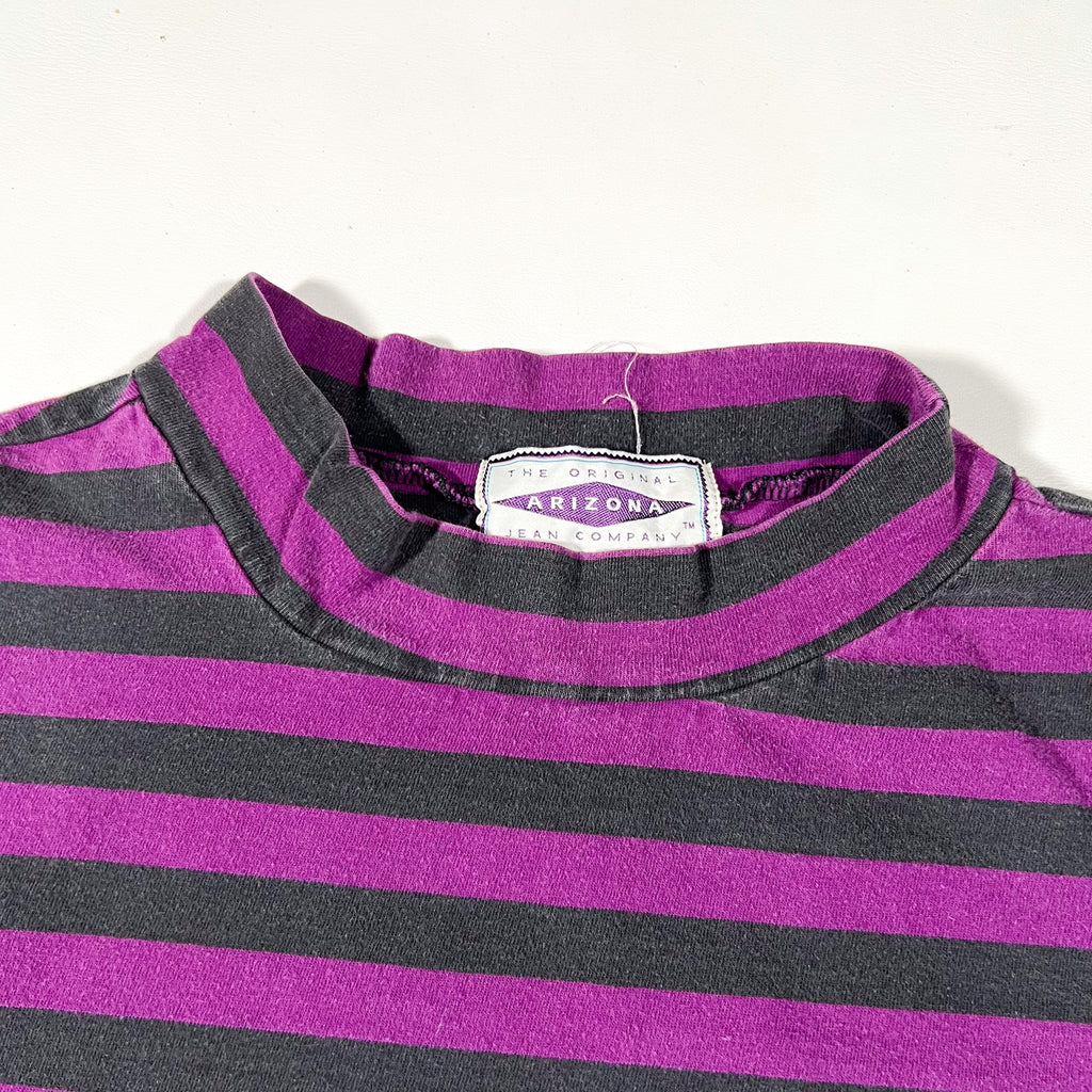 Vintage 1990’s Arizona Jeans Co. striped mock neck tee in a bold black and purple colorway. The black stripes can take on a slightly greenish cast depending on lighting, giving it a unique tonal look. Features an embroidered crest logo on the chest and a soft, worn-in 100% cotton feel. Made in Singapore. Light wear throughout from age, no major flaws noted.