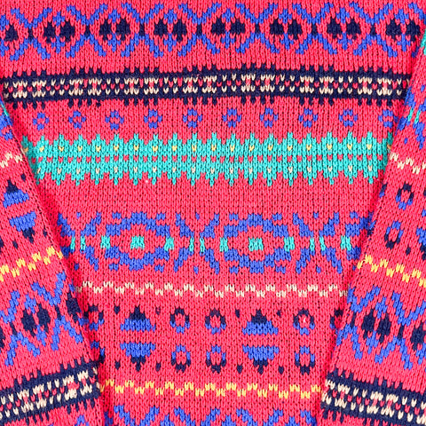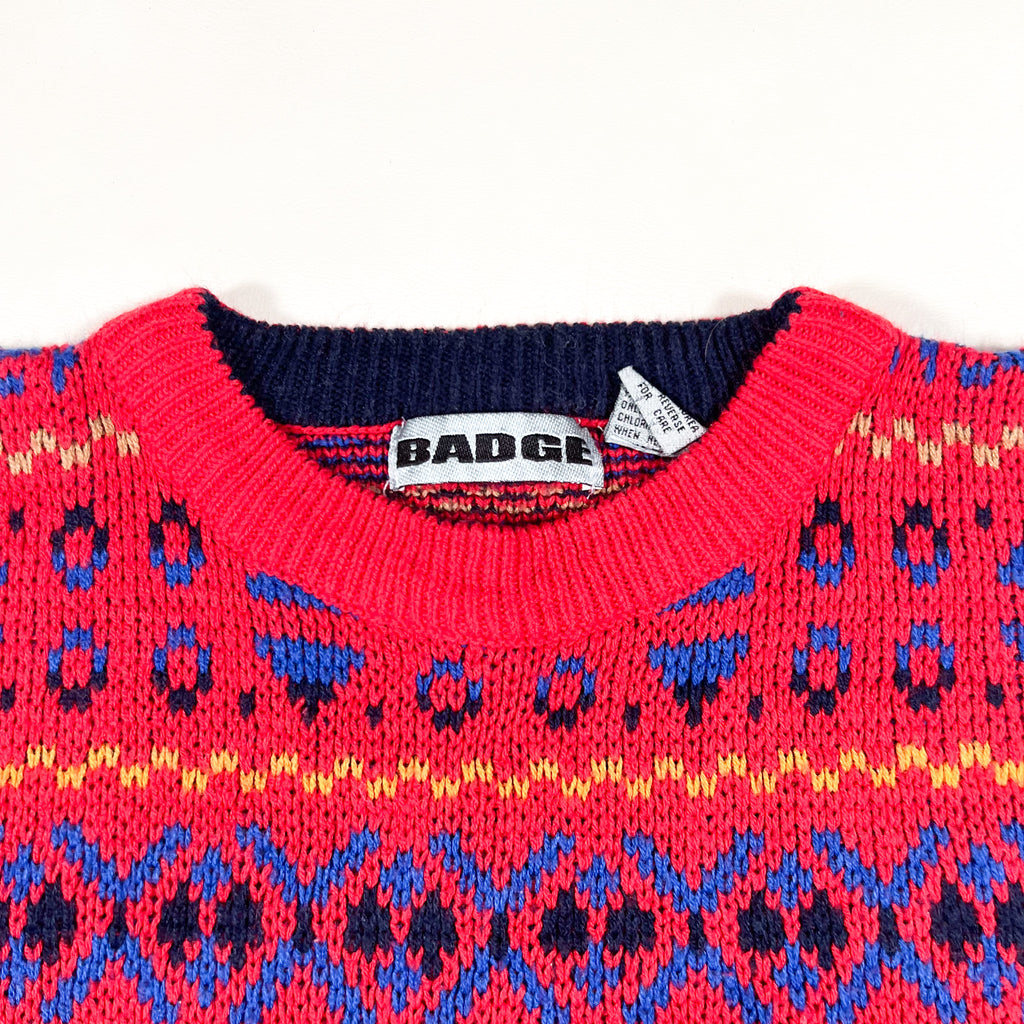 Eye-catching vintage 1990s Badge knit sweater featuring a vibrant geometric pattern in bold red, royal blue, green, and yellow tones. Made in Korea from 100% acrylic, this lightweight knit delivers that signature retro statement look — colorful, cozy, and full of character.