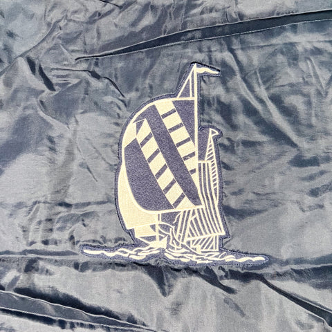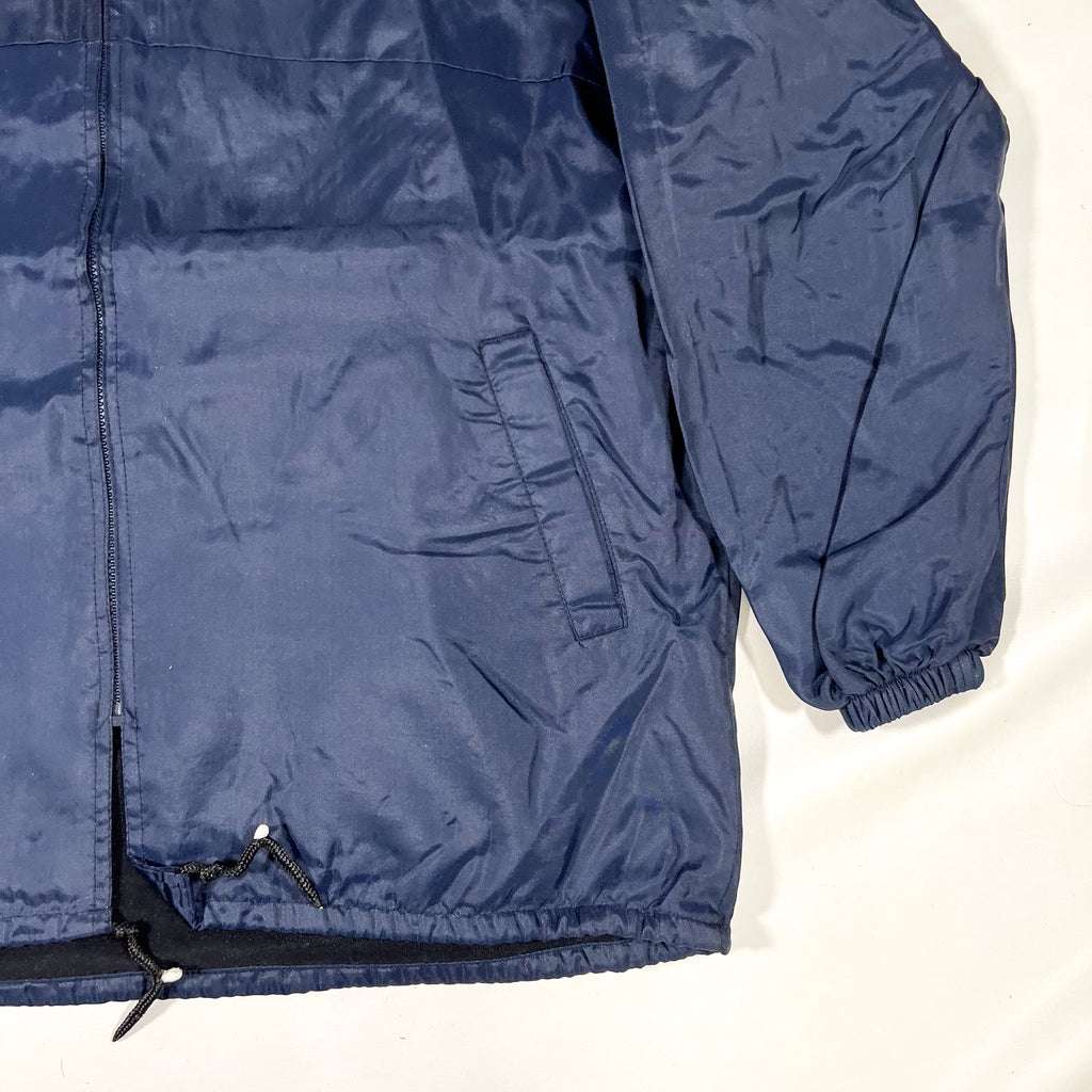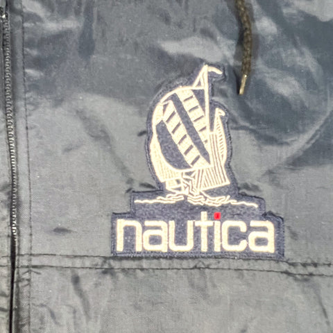 Vintage 90’s bootleg Nautica hooded windbreaker in classic navy nylon with oversized embroidered sailboat logo on the front and large back hit. Lightweight shell with a soft fleece lining, elastic cuffs, side pockets, and full zip closure. Drawcord at the hem allows for an adjustable fit.