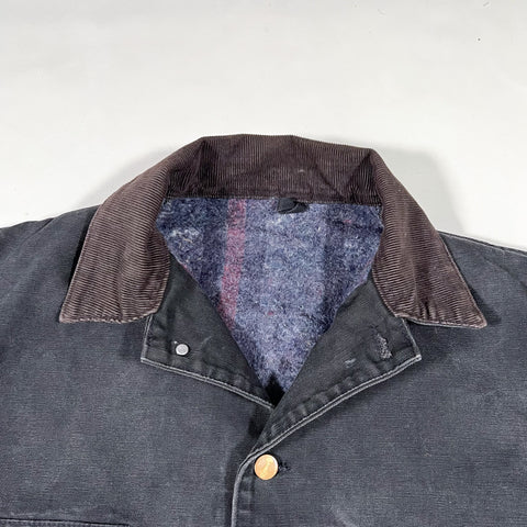 Vintage 1990’s Carhartt chore jacket in black heavyweight duck canvas, featuring a classic brown corduroy collar and warm blanket-lined interior. Built tough with a brass snap button front and multiple utility pockets, this is an iconic Carhartt workwear silhouette designed for durability and long-term wear.
