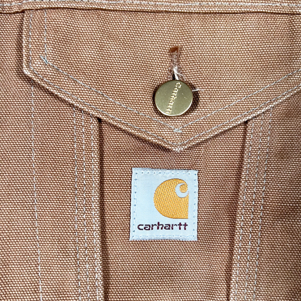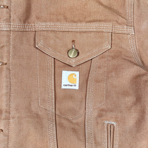 The jacket features a cropped trucker silhouette with button-through front, button-adjustable cuffs, and classic Carhartt branding at the chest. Built from rugged duck canvas and designed for utility and warmth, it shows natural wear and fading consistent with vintage use.