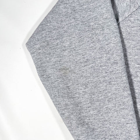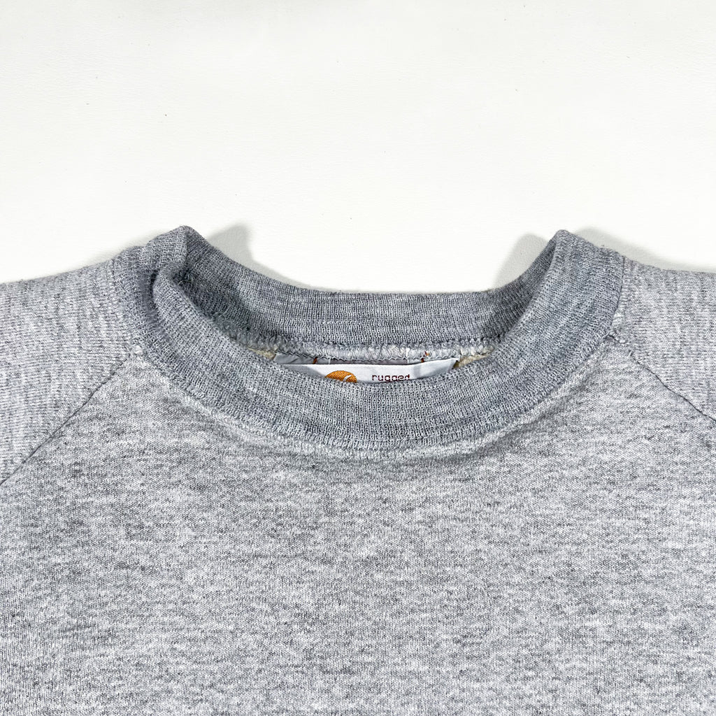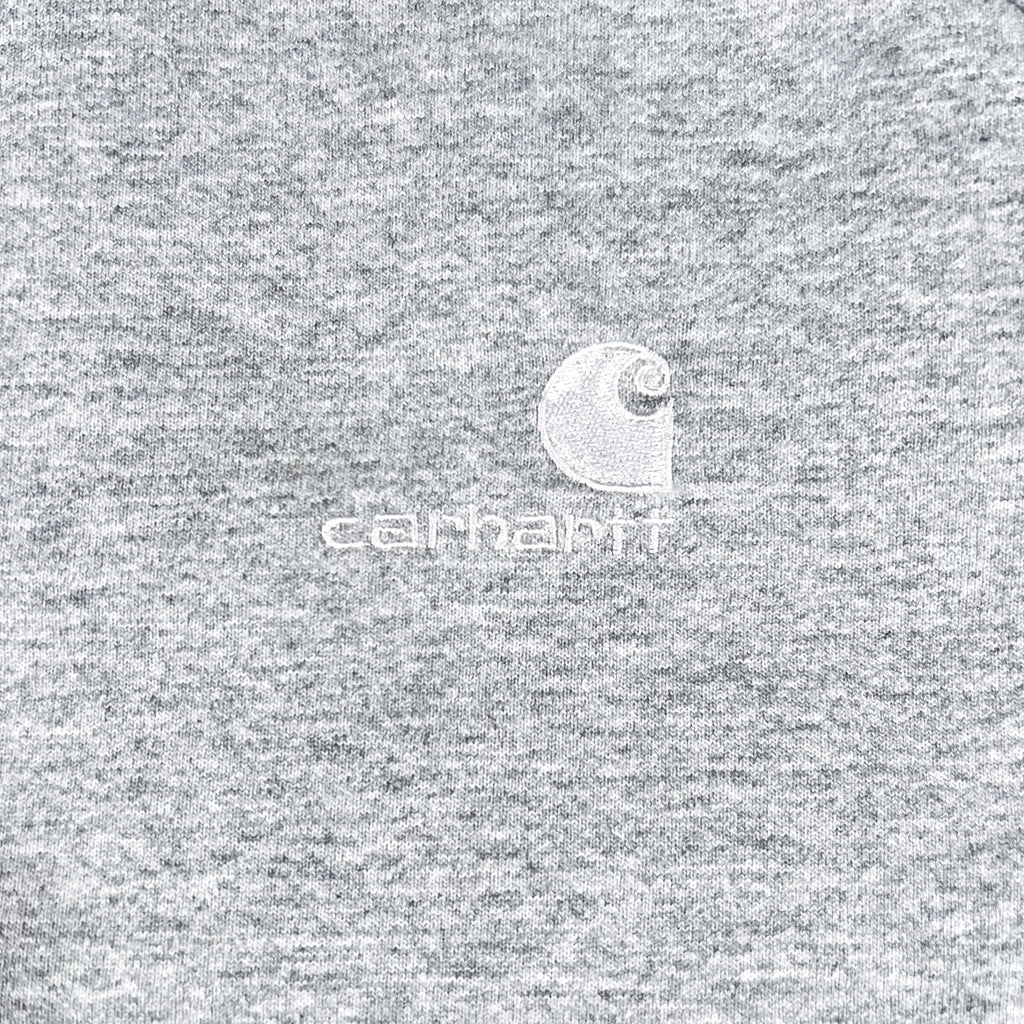 Classic heather grey Carhartt crewneck sweatshirt featuring the Rugged Outdoor Wear label — a vintage Made in USA line known for its durable construction and thermal lining. This piece features a 50/50 cotton-poly shell with a cream waffle-knit polyester lining, perfect for cold weather layering. Minimal Carhartt logo embroidery at the chest and ribbed cuffs, hem, and collar for a secure fit.