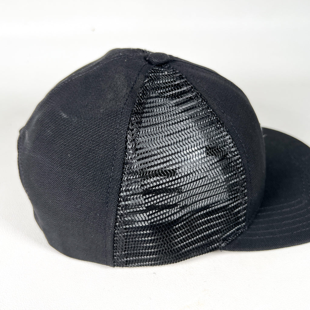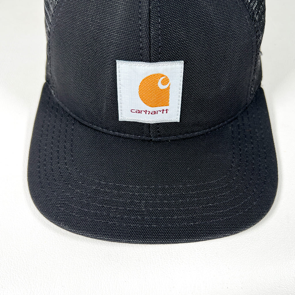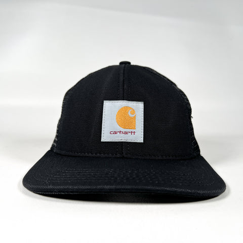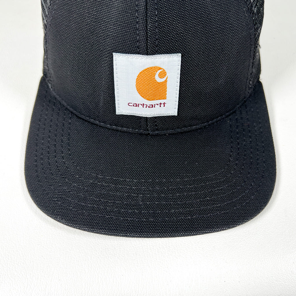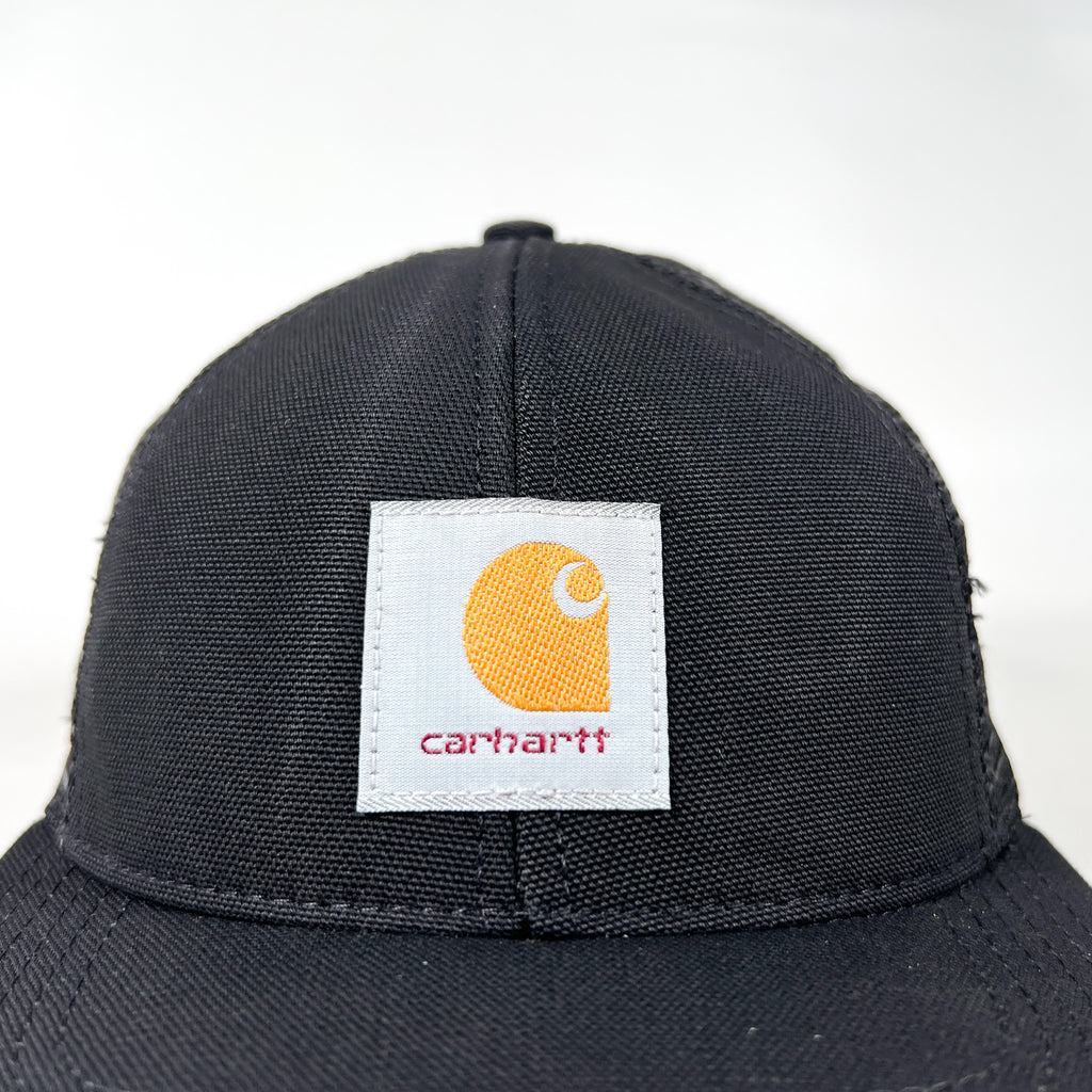Classic 90s Carhartt trucker hat featuring the iconic Carhartt logo patch on a structured black crown. Timeless workwear look with a clean all-black colorway and breathable mesh back—staple piece with strong vintage utility style.